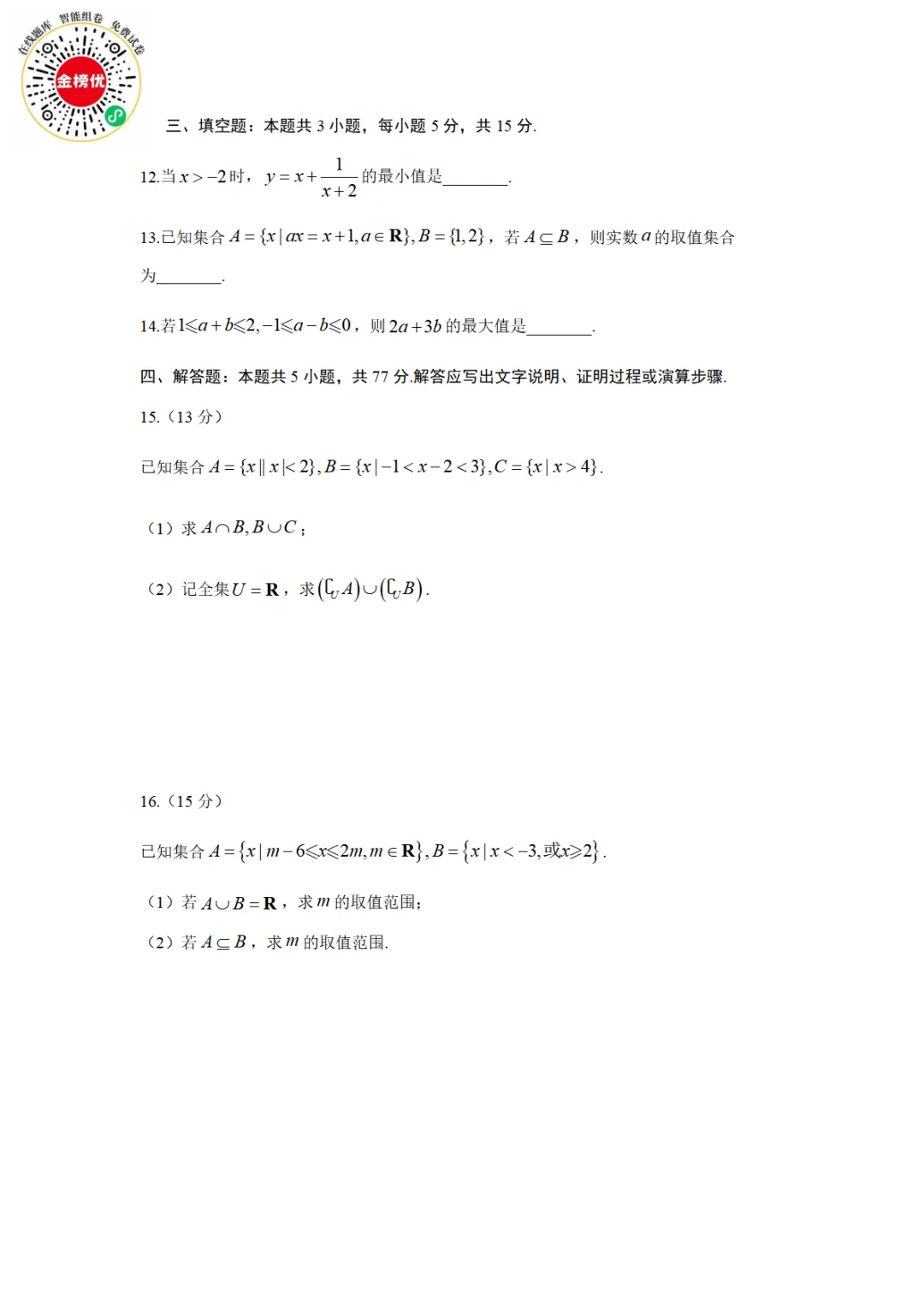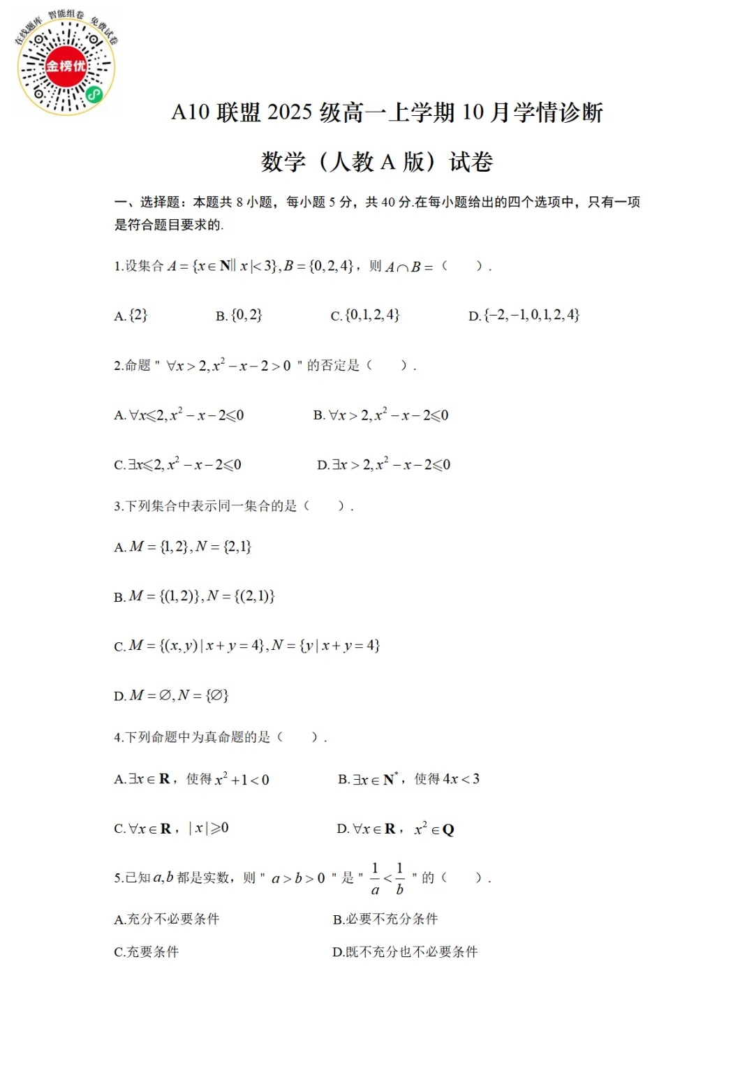 【精品word版】A10联盟2025级高一上学期10月学情诊断数学试题+答案