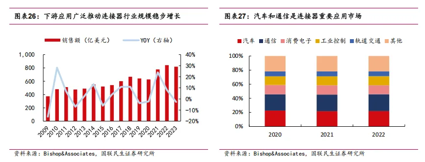 连接器下游应用广泛,不同应用领域技术变革推动行业规模稳步向上,汽车和通信成为未来重要增量市场。连接器在实际中广泛应用于各大终端市场,过去15年受益汽车、通信、消费电子、工控等领域需求快速提升,行业规模基本翻倍达到800多亿美元的水平。2023年全球连接器销售额为818亿美元,同比-2.7%,2013-2023年CAGR为5.3%。下游来看,目前汽车和通信为主要应用市场,2022年汽车和通信应用占比分别为21.9%/23.8%,工控和消费电子占比均为12.8%,汽车和通信占据主要份额系汽车新四化、5G通信、AI服务器等需求快速提升。