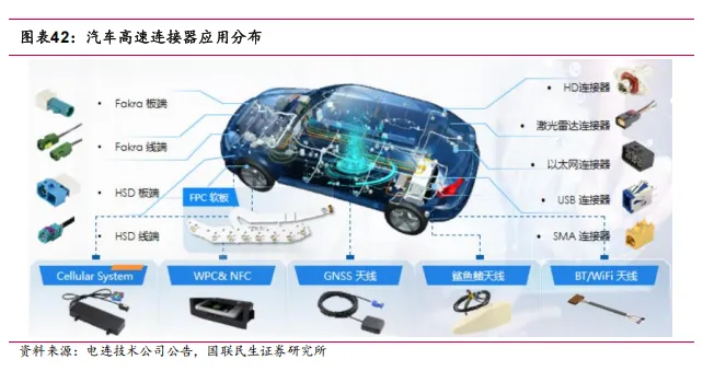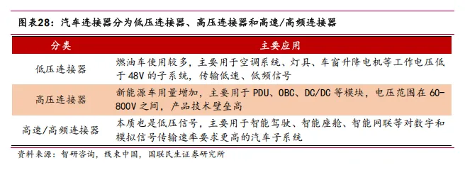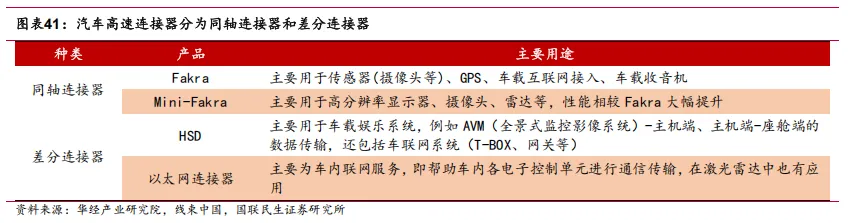 3)高速/高频连接器:主要用于智能驾驶、智能座舱、智能网联等对信号传输速率和频率要求更高的汽车子系统,随着汽车智能驾驶和智能座舱等快速发展,车载通信向以太网过渡,对于高速/高频连接器需求进一步提升。高速/高频连接器传输的也是低压信号,在这里我们跟普通的只传输低速/低频信号的连接器作了区分。