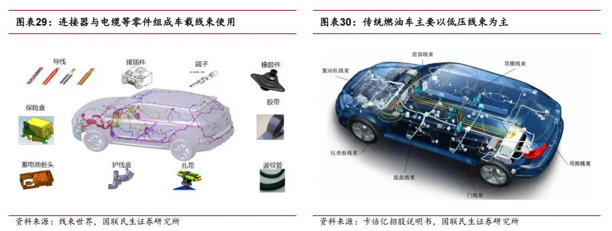 汽车连接器通常与电线电缆压接,通过塑压绝缘体或外加金属壳体等,以线束组件的形式构成车载电路的网络主体。分类方面,与低压、高压、高速/高频分别配合的线束组件分别称为低压线束、高压线束和高速/线束,传统燃油车主要以发动机、仪表板、车身、门、顶棚等线束为主。