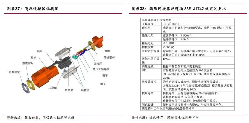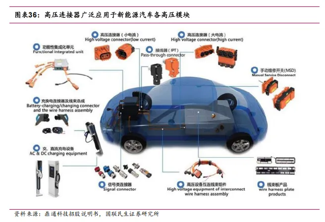 2)高压连接器:新能源车通过三电系统替换传统动力系统中发动机和变速箱,电压/电流平台提升,PDU(电源分配单元)、OBC(车载充电器)、DC/DC模块等对高压连接器的需求大幅提升,新能源车电压平台已逐步由400V向800V升级,高压连接器需要具备良好的载流能力、温升、插拔寿命和电磁屏蔽等性能;