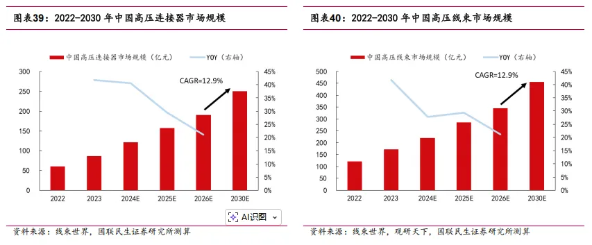 新能源渗透率继续提升带动高压连接器需求释放,预计2030年高压连接器市场规模有望达到250.5亿元。根据线束世界,新能源乘用车单车高压连接器使用数量在6-15对之间,单车价值量大约在700-1200元,随着整车电压由400V向更高的800V演进,预计高压连接器单车价值量有上升趋势。根据我们假设和测算,2024年国内高压连接器市场规模约121.2亿元,预计2030年有望达到250.5亿元,2024-2030年CAGR为12.9%。根据观研天下数据,高压连接器占到线束价值量的50%左右,预计2024年汽车高压线束市场规模约220.3亿元,2030年有望达到455.5亿元,国内高压连接器及线束厂商成长空间广阔。