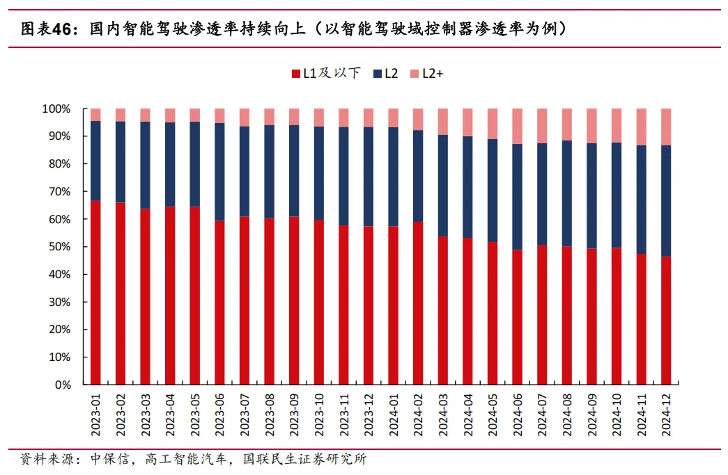 我们将标配高速NOA或自动变道辅助ALC功能定义为L2+,根据高工智能汽车和中保信数据,2024年L2+车型累计销量260.0万辆,渗透率达到11.3%,2024年4月以来月度渗透率均超过10%,产业进程有望加速。