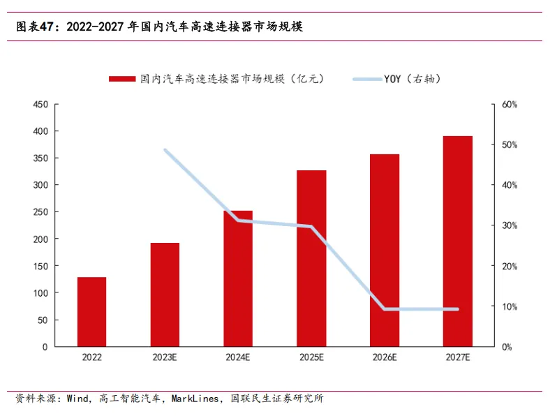 我们认为,高阶智驾功能开始落地,叠加座舱配置持续升级,有望带动汽车高速连接器规模实现快速增长,预计2027年国内汽车高速连接器市场规模有望达到390.56亿元,较2022年增长202%,2022-2027年复合增速为24.8%。