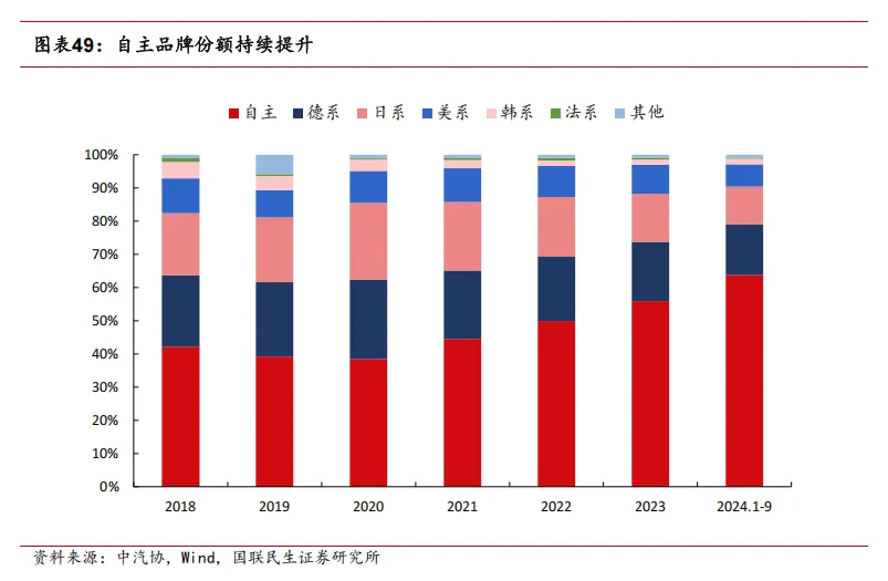 覆盖国内主流新能源车企,自主份额提升进一步带动公司收入增长。根据公司2021年定增公告,公司基本覆盖了国内前十大新能源整车、国际主流新能源整车企业和电池电机厂商,新能源销量增长及自主品牌份额提升,带动公司新能源汽车业务收入持续增长,客户覆盖全面优势进一步体现。2024年1-9月,自主品牌乘用车批发份额达到63.8%,同比+9.3pct,保持快速提升趋势。