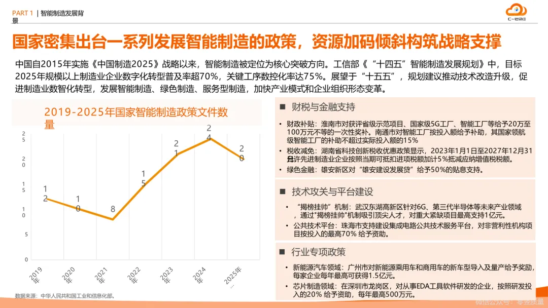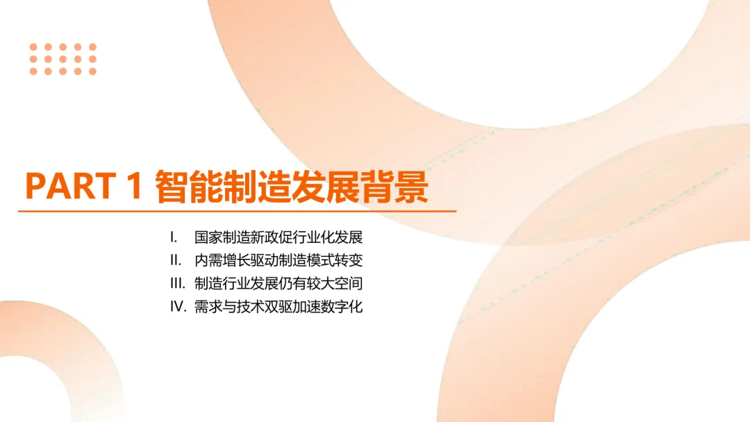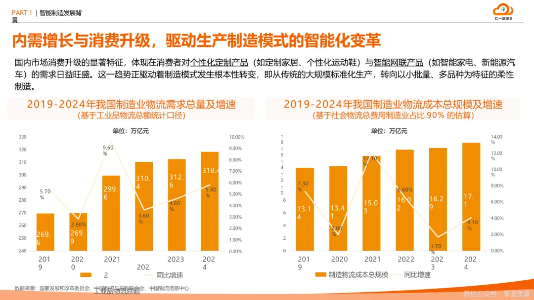 国家密集出台政策推动智能制造发展,明确 2025 年规模以上制造业企业数字化转型普及率等目标,各地还有财政补贴、税收减免等支持措施。内需增长促使制造模式从大规模标准化生产转向柔性制造,制造业物流需求和成本规模稳步增长。目前行业仍存在中小微企业转型滞后、劳动生产率待提升、数字化渗透率低等问题,而新一代技术的发展,为行业数字化转型提供了有力支撑。