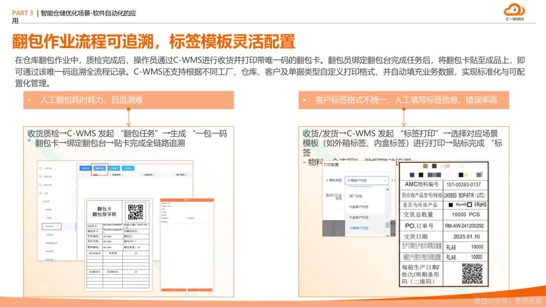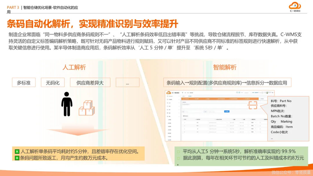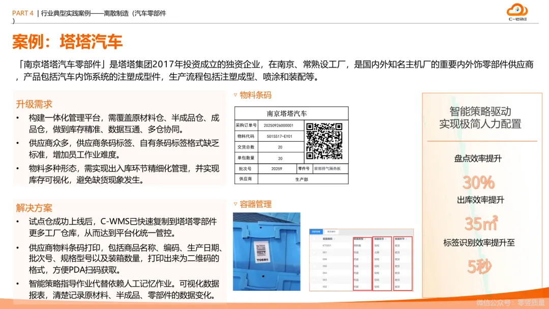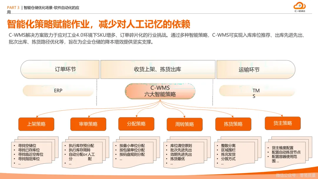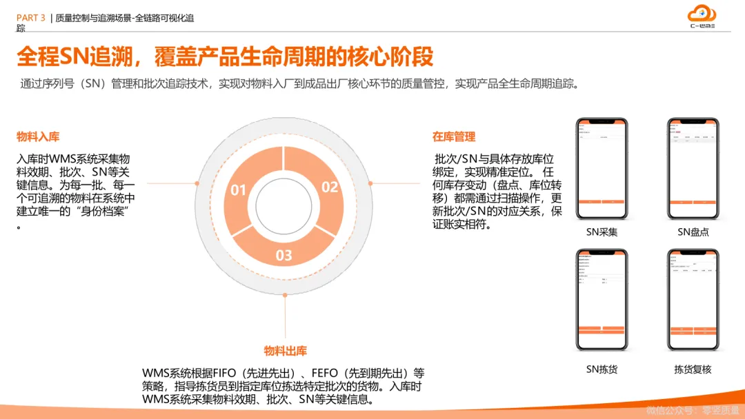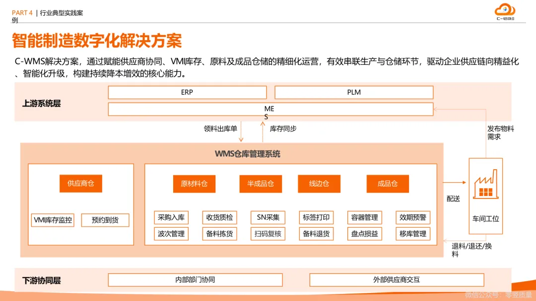 智能仓储优化场景通过 C - WMS 的六大智能策略、波次管理、条码自动化解析等软件应用,结合 BI、数字孪生及自动化硬件设备,实现仓储高效运营。生产物流协同场景构建了全链路协同体系,通过全局库存可视化、线边仓预警机制、齐套配货协同等,缩小供需差距。质量控制与追溯场景借助 SN 追溯、质检线上化、作业单视频回放,实现全链路质量管控。AI 技术应用场景通过 AI 在线助手、虚拟员工、OCR 视觉识别,优化决策与运营。