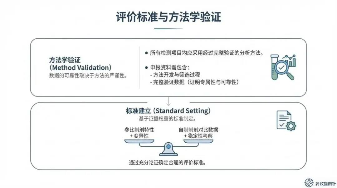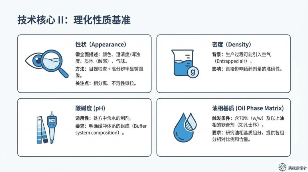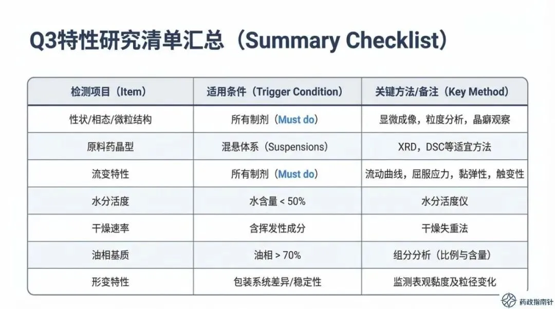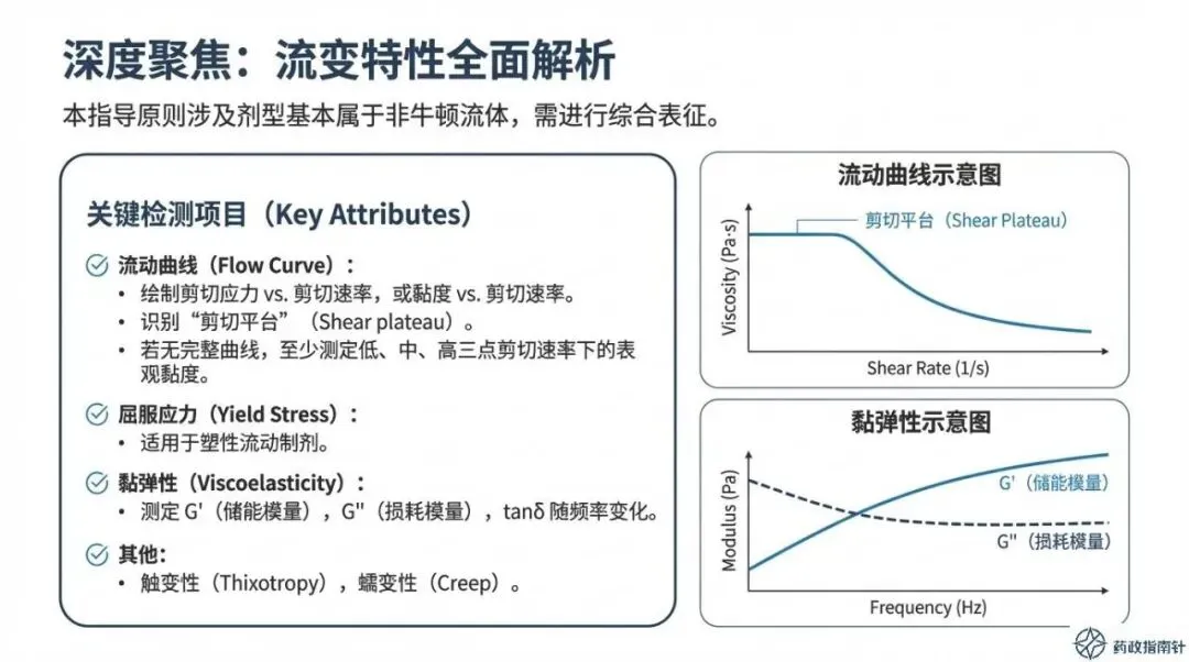 通过这份PPT的梳理不难发现,CDE对Q3特性的要求已从简单的“数据呈现”升级为严密的“逻辑论证”。指导原则明确划定了技术红线:所有检测项目均需采用经过完整方法学验证的分析方法,并随附详尽的方法开发与筛选过程数据 。这意味着,仅靠单点粘度或简单的目测已无法通过当下的注册审评,研发团队必须建立起基于科学原则的完整证据链,以证明所采用方法的专属性与可靠性。