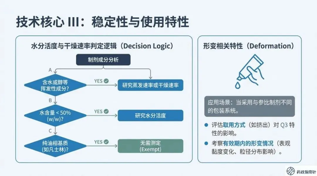 在实战中,Q3特性的一致性对比往往伴随着各种波动。指导原则特别指出:若存在差异,需提供详尽说明及相关依据,以证明其不影响药物的质量、安全性与有效性 。这实际上为具有深厚CMC底蕴的企业留下了“科学申辩”的空间,也强调了深研药学本质的重要性。无论是流变曲线的微小偏离,还是水分活度的临界变化,每一个数据的波动都承载着对生产工艺稳定性与产品质量属性(CQA)的深刻洞见。“工欲善其事,必先利其器。”Q3特性研究不仅仅是为了拿到一份合格的审评报告,更是为了让我们更透彻地理解自己的产品。从油相基质的组分比例到触变性与蠕变性的细微变化,每一个参数的波动,都是产品质量的一面镜子 。