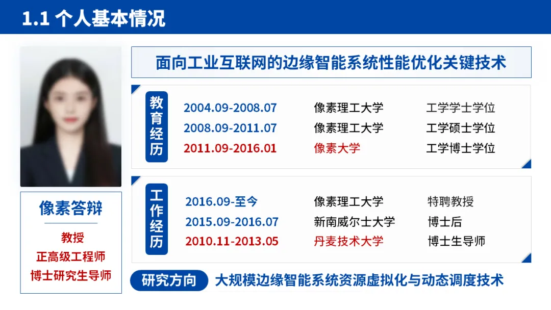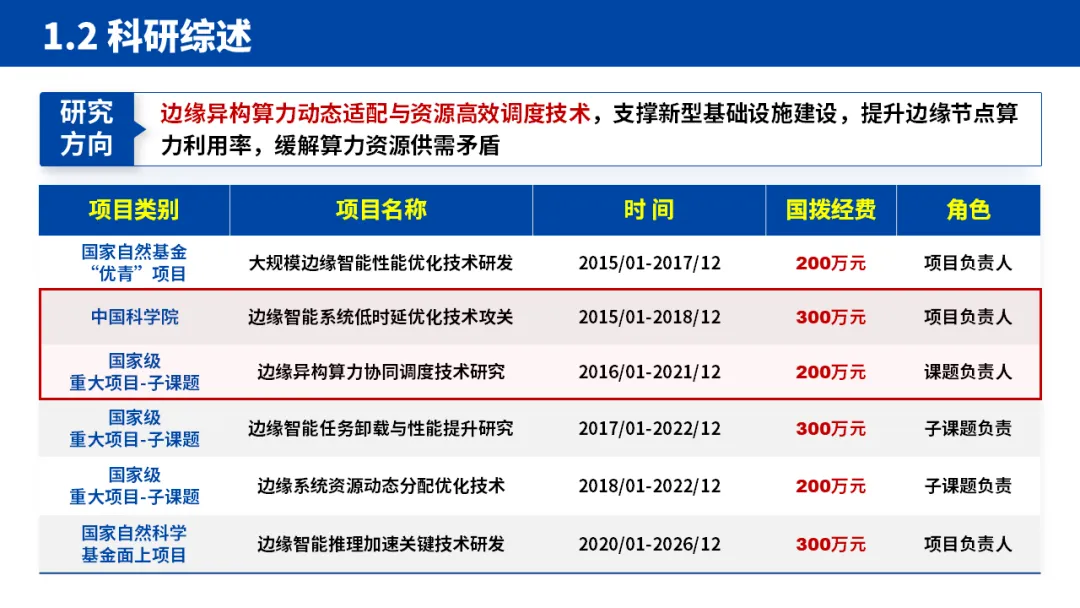 1.开篇立人:个人基本情况奠定基础:先明确汇报人的教育背景、工作经历、研究方向,再通过项目经历和荣誉奖项建立可信度。特别是将核心研究方向与国家重大需求(如新型基础设施建设)绑定,开篇就凸显研究的价值站位。项目列表用表格清晰呈现,国拨经费、角色、时间等关键信息一目了然,让评审快速 get 核心贡献。