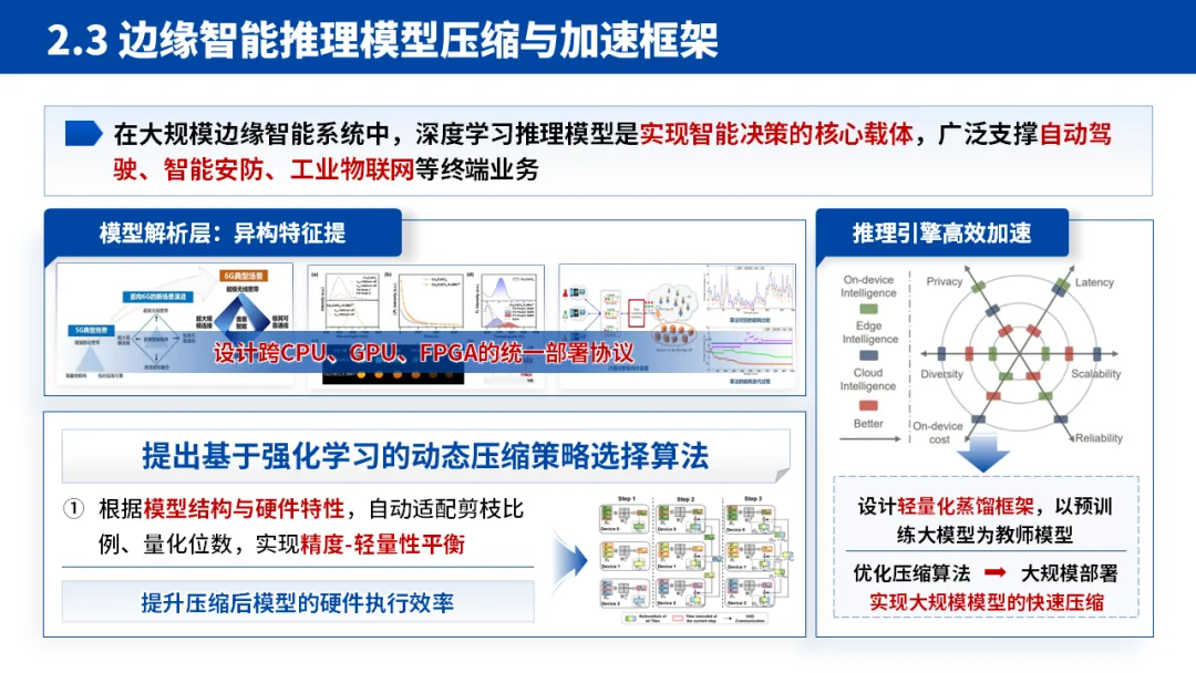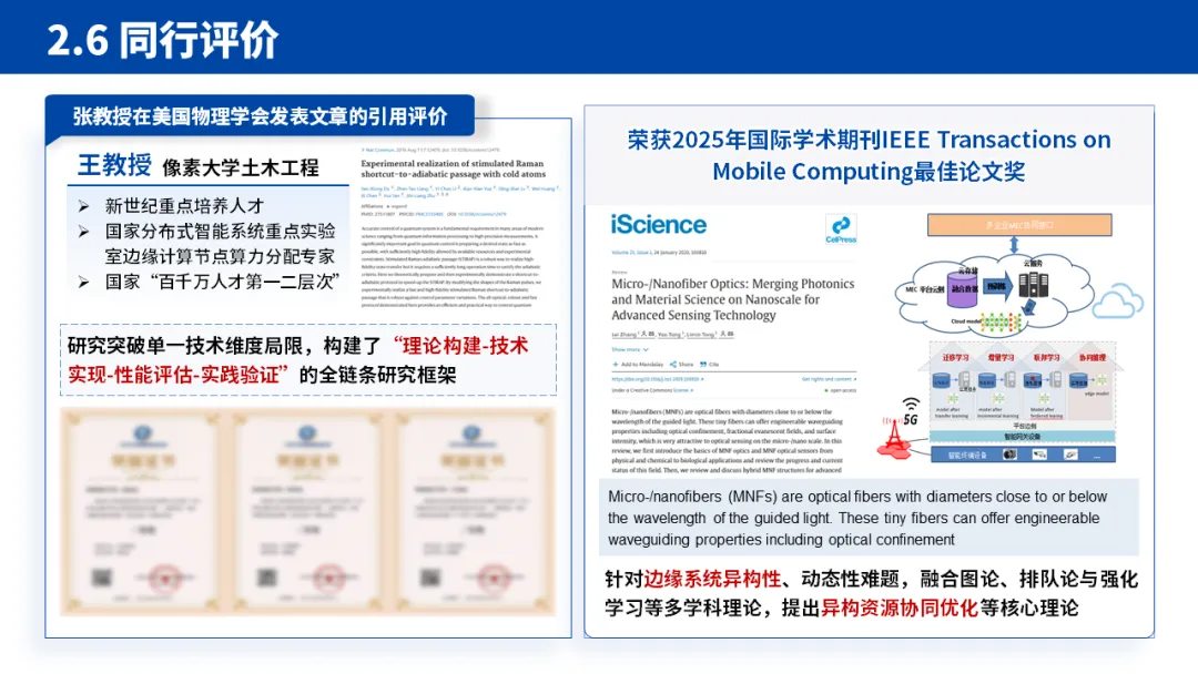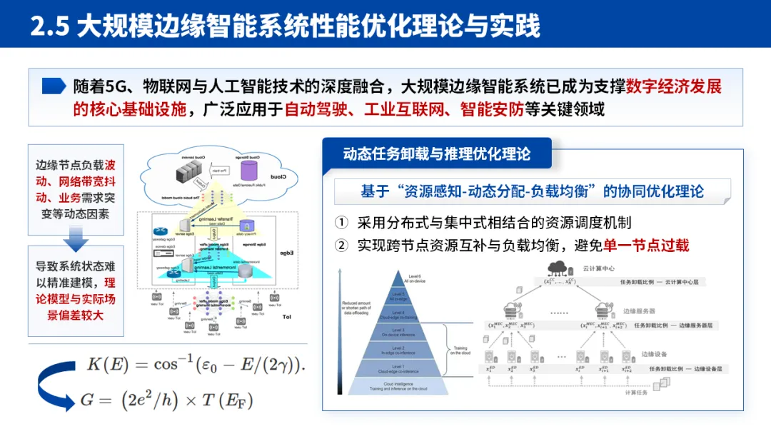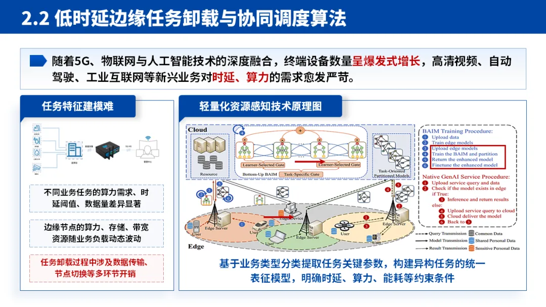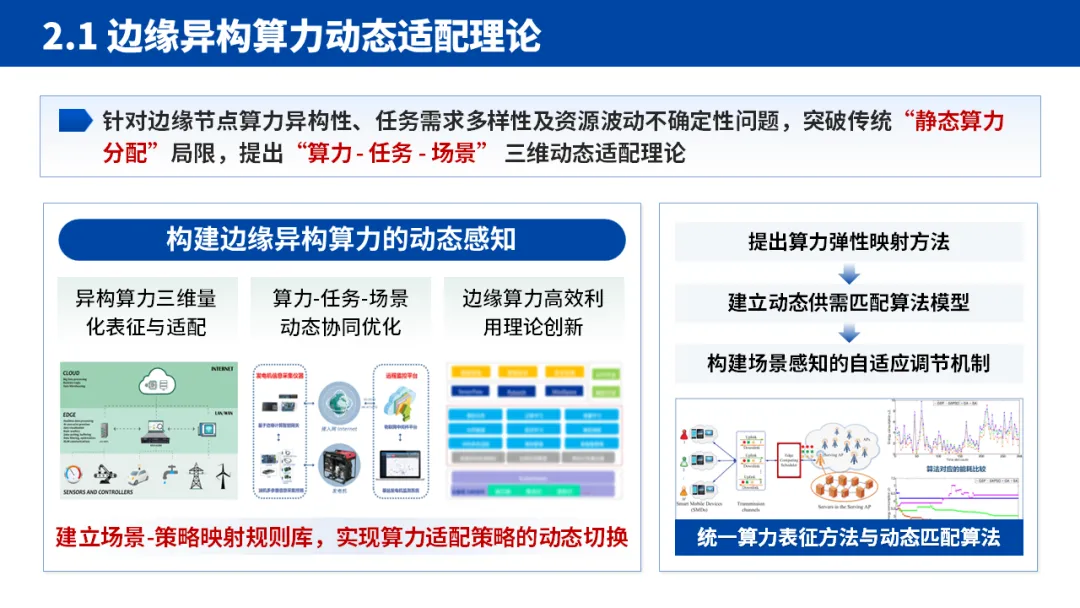 2.核心论证:学术成绩彰显硬实力:这是 PPT 的核心板块,采用 “理论 - 技术 - 实践 - 评价” 的子逻辑。先提出 “边缘异构算力动态适配” 等核心理论,再落地为 “低时延任务卸载算法”“模型压缩加速框架” 等具体技术,最后通过性能评估方法和实际应用场景验证效果。每个技术点都紧扣 “解决什么问题 - 提出什么方案 - 达到什么效果” 的逻辑,让评审清晰看到研究的完整性。
