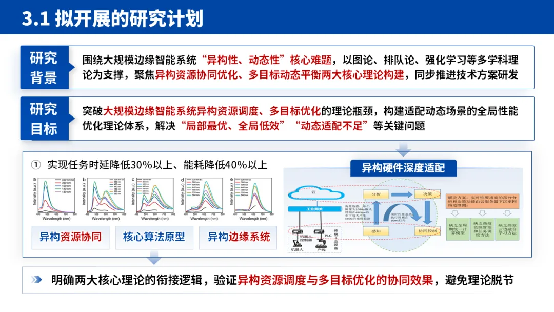 3.未来可期:拟开展工作展现前瞻性:基于现有成果,明确后续研究的背景、目标和核心内容。不仅提出 “任务时延降低 30%、能耗降低 40%” 等量化目标,还强调理论间的衔接逻辑,避免 “空中楼阁” 式规划,展现研究的延续性和可行性。