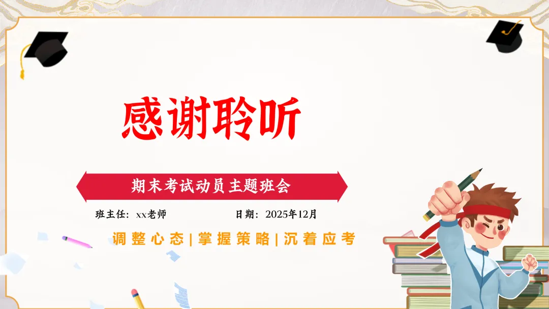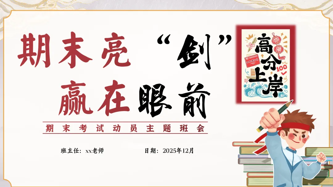 很高兴在这与您相遇,如果您是一位班主任老师,每天除了应对繁重的教学工作,还要加班整理班级、教务、教研、课件PPT资料,请关注下方的“小木教务资料”,让我们风雨同路、一起成长~今天分享的是中小学通用期末考前动员主题班会的ppt课件及配套的发言稿及教案,主题是《期末亮剑,赢在眼前》期末亮“剑” 赢在眼前——期末考前动员主题班会逐字发言稿