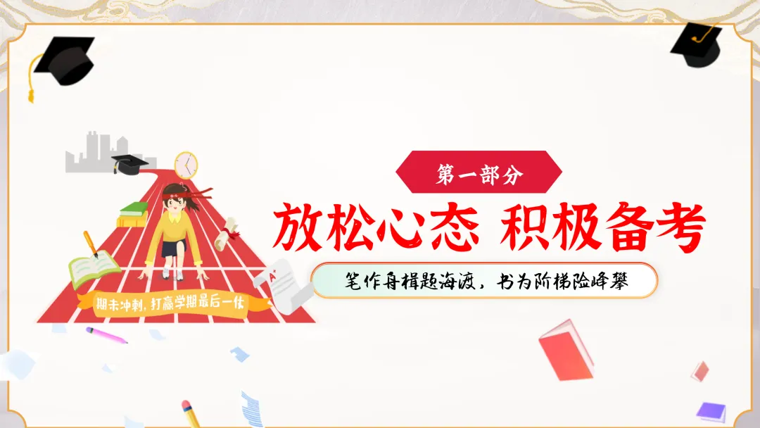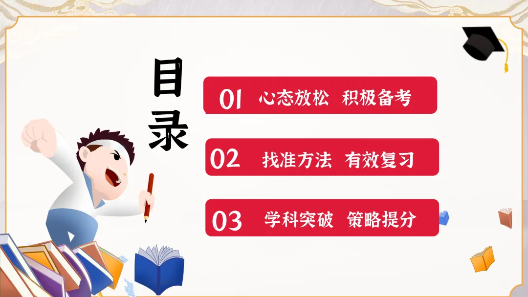 今天的班会主要分为三个部分:第一部分是放松心态积极备考,第二部分是找准方法有效复习,第三部分是各科突破策略提分。希望大家认真聆听,有所收获。