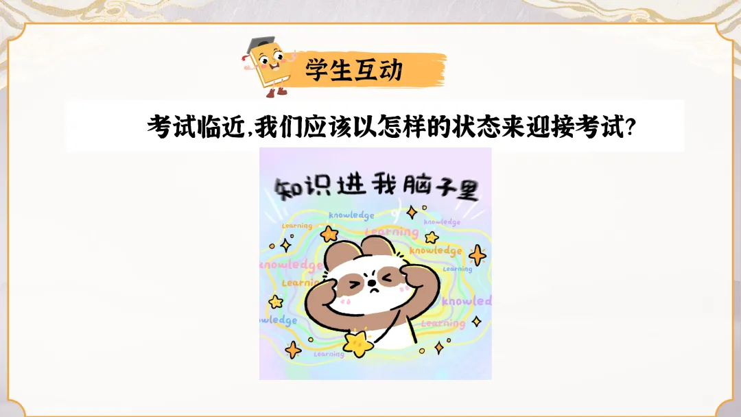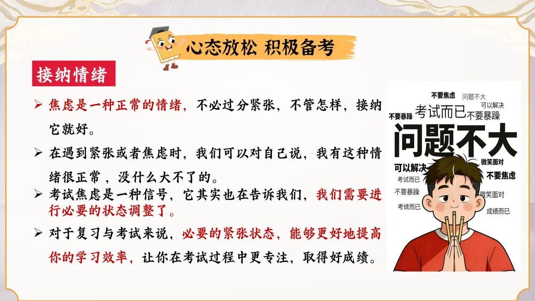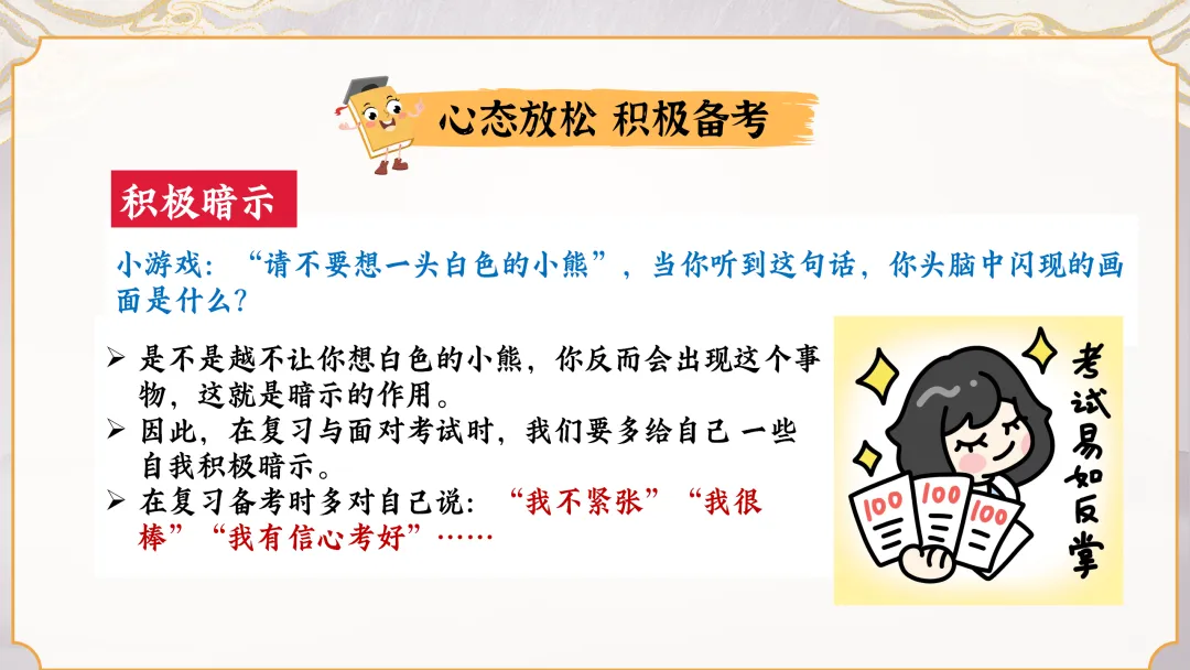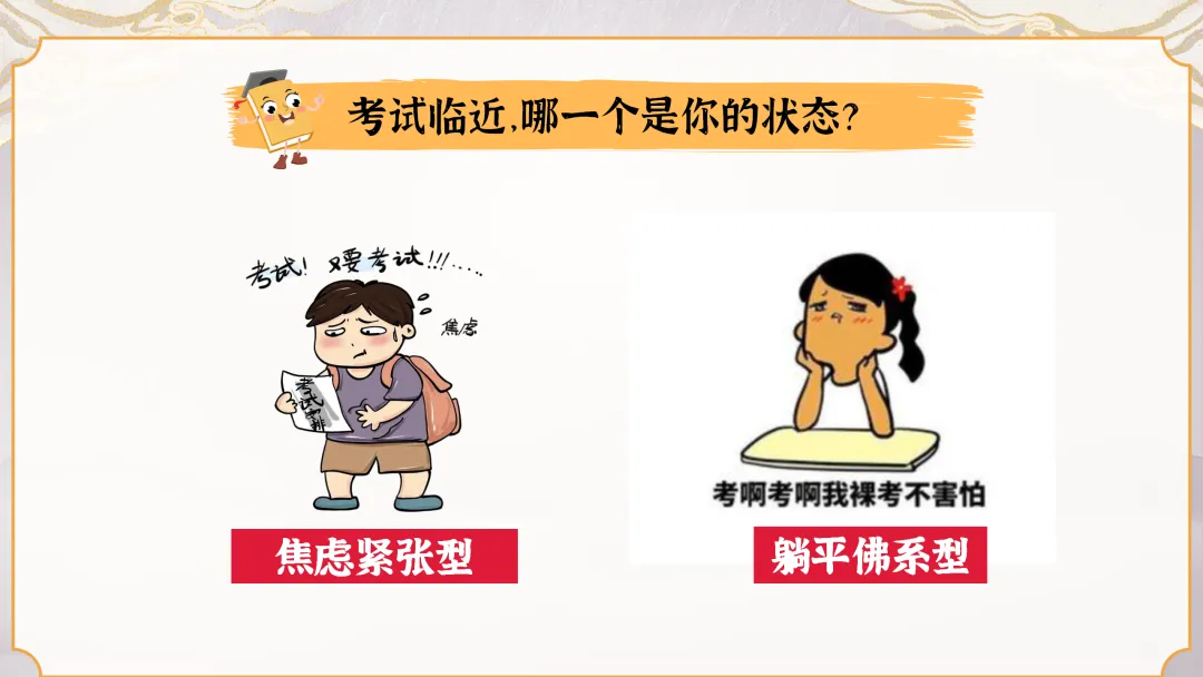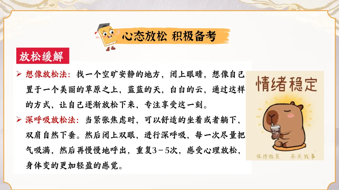 最后,给大家介绍两种放松缓解的方法。第一种是想象放松法:找一个空旷安静的地方,闭上眼睛,想象自己置身于一个美丽的草原之上,蓝蓝的天,白白的云,通过这样的方式,让自己逐渐放松下来,专注享受这一刻。第二种是深呼吸放松法:当紧张焦虑时,可以舒适地坐着或者躺下,双肩自然下垂。然后闭上眼睛,进行深呼吸,每一次尽量把气吸满,然后再慢慢地呼出,重复3 - 5次,感受心理放松,身体变得更加轻盈的感觉。大家可以在平时的复习和考试中尝试这些方法,帮助自己缓解紧张情绪。