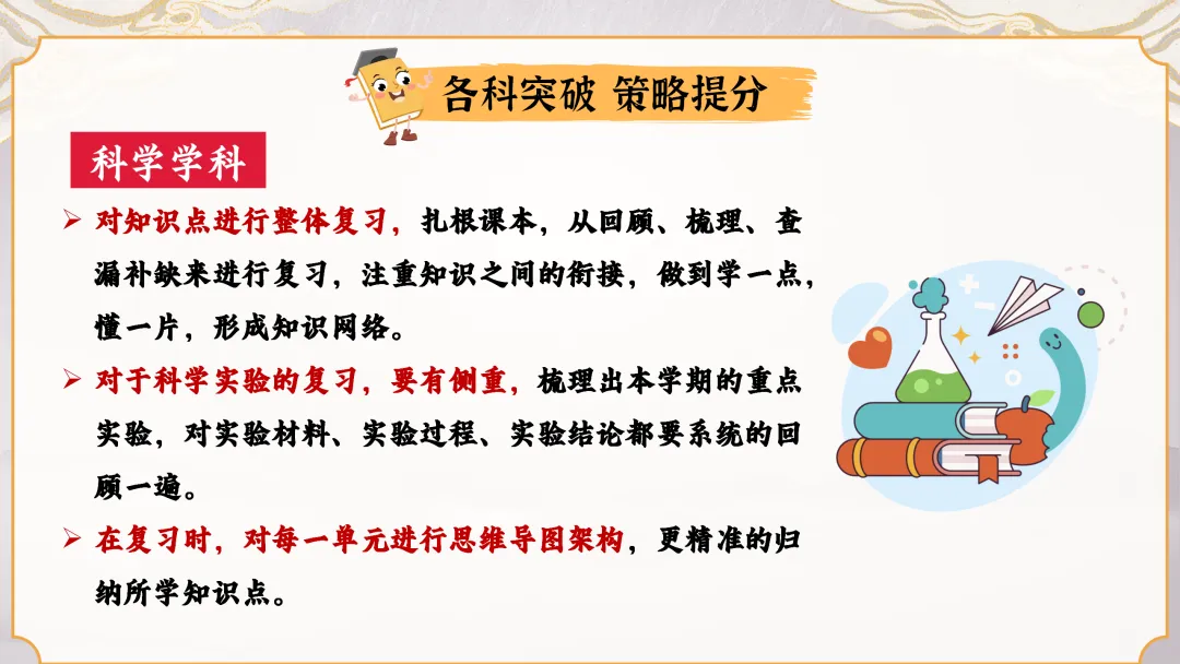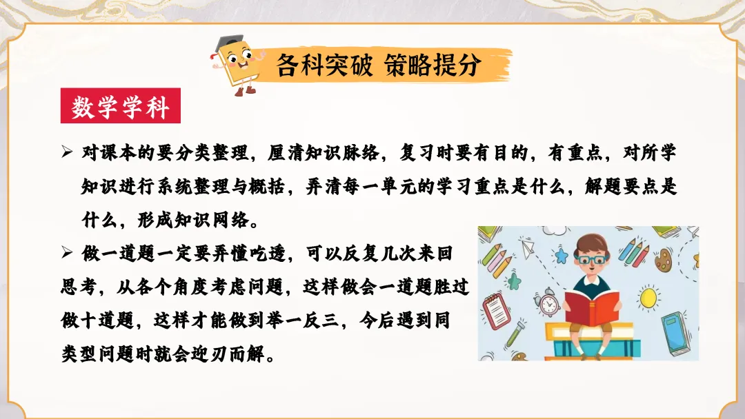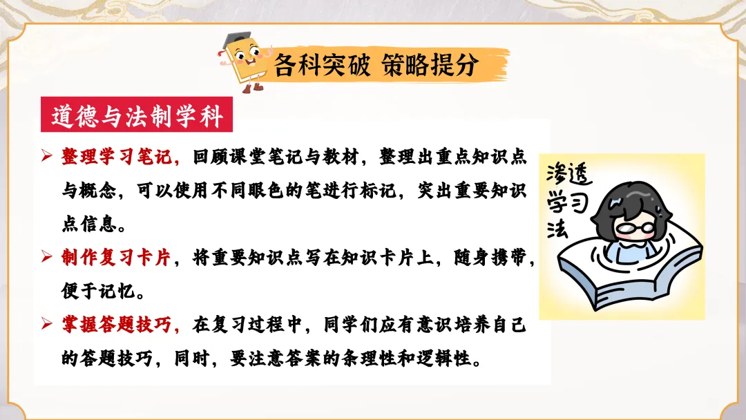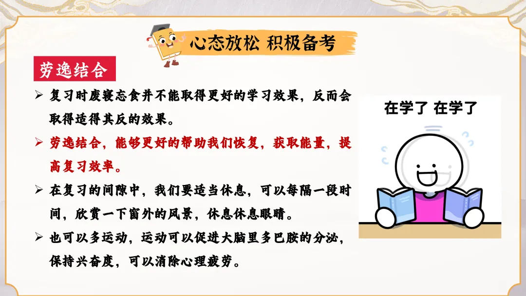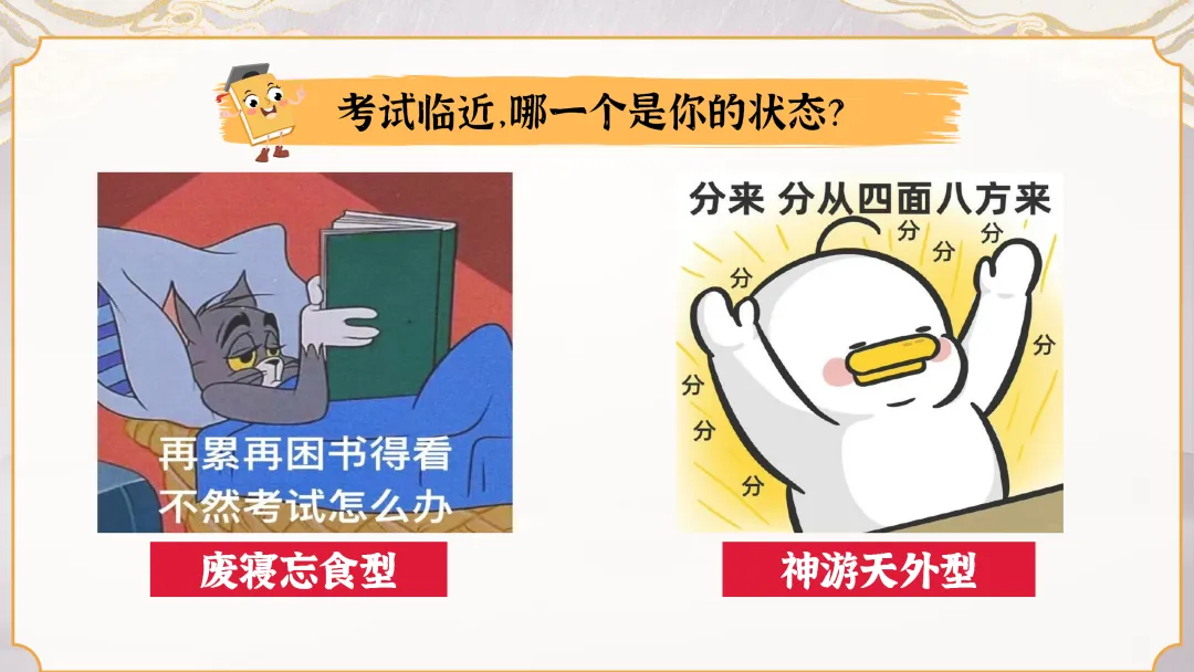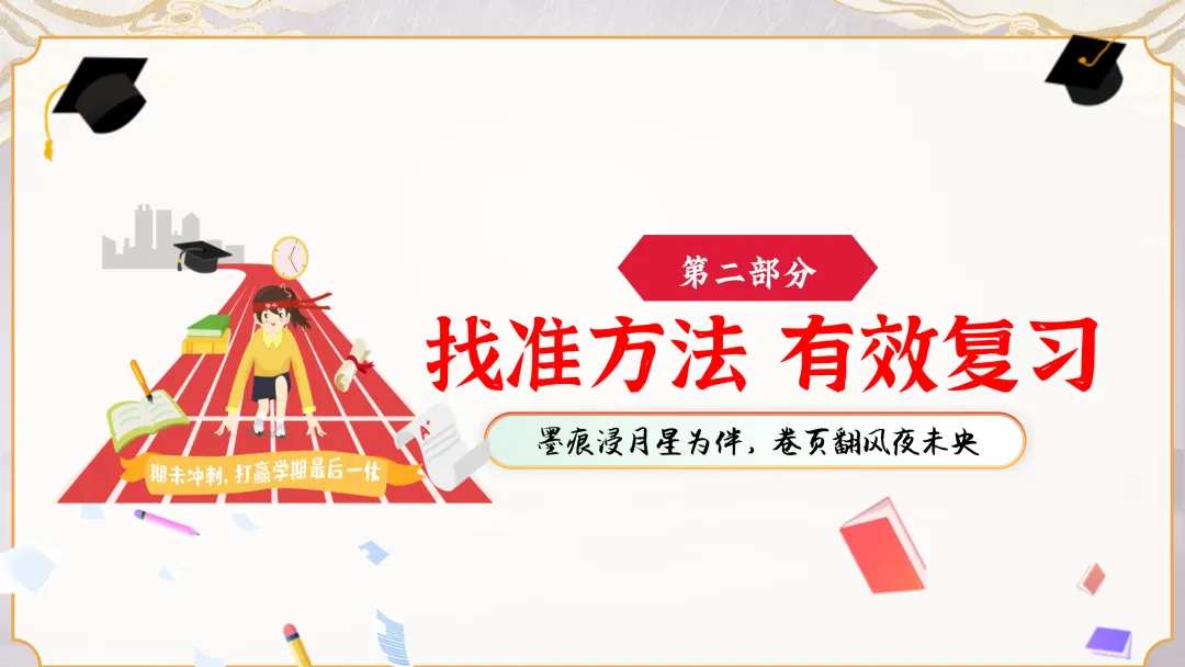 好的,第一部分的内容就到这里。接下来我们进入第二部分,找准方法有效复习。“墨痕浸月星为伴,卷页翻风夜未央”,期末冲刺,我们要打赢学期最后一战,就需要掌握有效的复习方法。