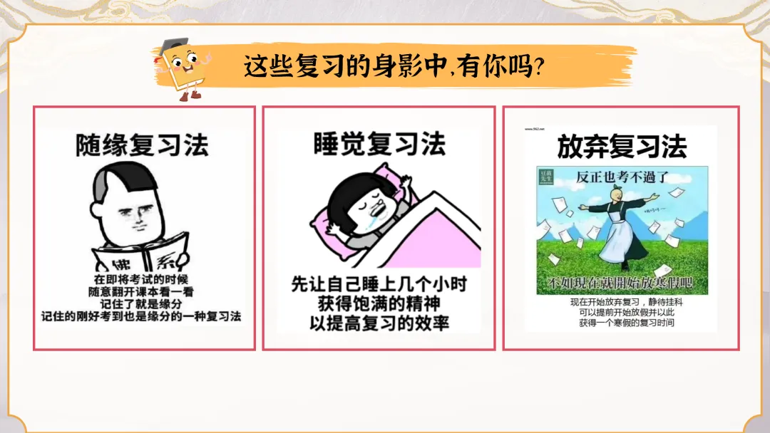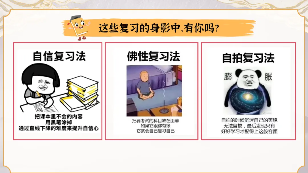 同学们,先来看一下这些有趣的复习方式。佛性复习法,把要考试的科目放在面前,如果它跟你有缘,它就会自己复习自己;自拍复习法,自拍的时候沉迷自己的美貌无法自拔,最后发现只有好好学习才配得上这般容颜。当然,这些都是玩笑话,真正有效的复习需要我们掌握正确的方法。