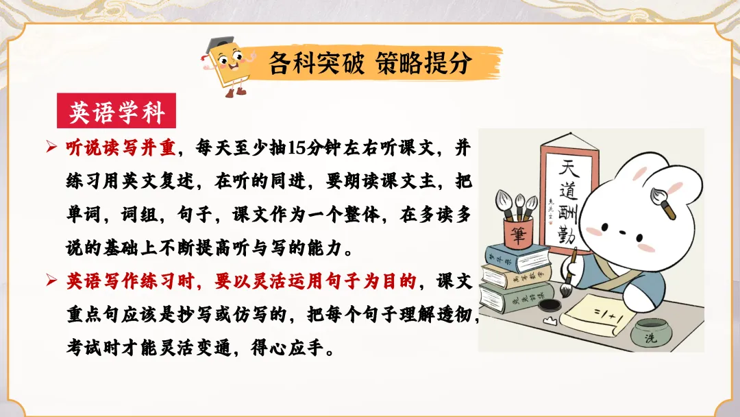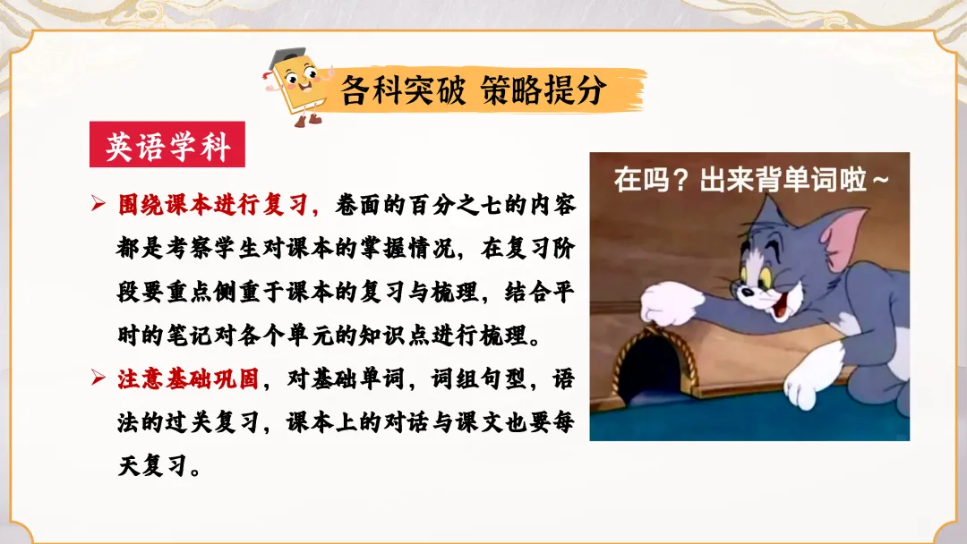 接下来是英语学科。围绕课本进行复习,卷面的百分之七十的内容都是考察学生对课本的掌握情况,在复习阶段要重点侧重于课本的复习与梳理,结合平时的笔记对各个单元的知识点进行梳理。注意基础巩固,对基础单词、词组、句型、语法进行过关复习,课本上的对话与课文也要每天复习。
