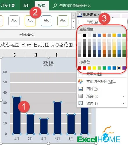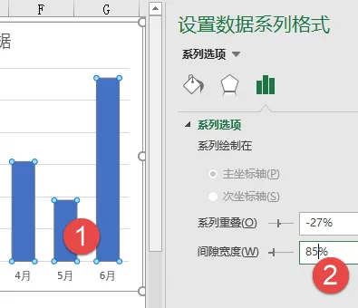 点击左侧的【编辑】按钮,修改系列值为:=Sheet1!数据“Sheet1”是实际的工作表名,“数据”就是咱们刚刚定义的名称了,记得中间要有一个感叹号!。点击右侧的【编辑】按钮,修改轴标签区域为:=Sheet1!日期双击图表中的柱子,设置格式,将间隙宽度调整为85%左右,这里的数值越小,柱子间隔就越小,看起来不会太单薄。然后依次单击图表中的不同元素,在格式选项卡下设置填充颜色。