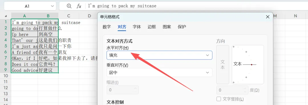 1、选中所有内容,按ctrl+1,水平对齐方式选择填充