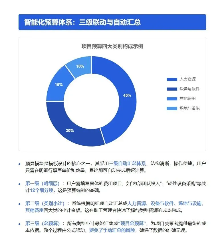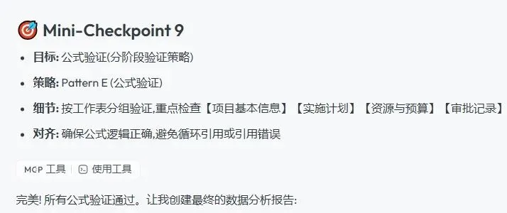 📊 公式验证结果✅ 所有40个公式验证通过:预算汇总体系(12项明细→4个小计→总预算)、工期计算(20个任务行)、跨表引用(2处)全部正确运行! | |