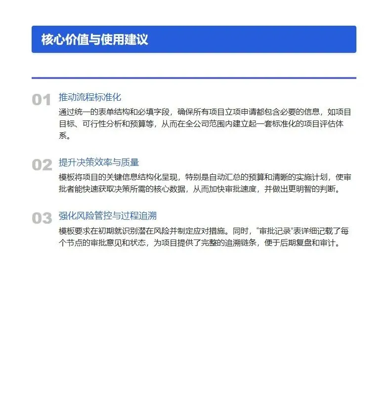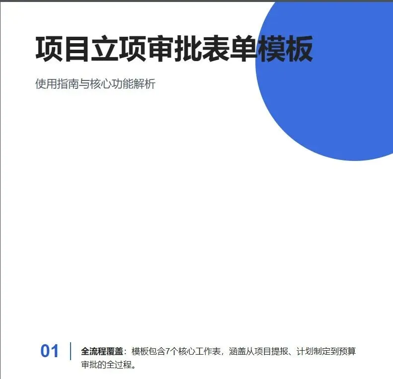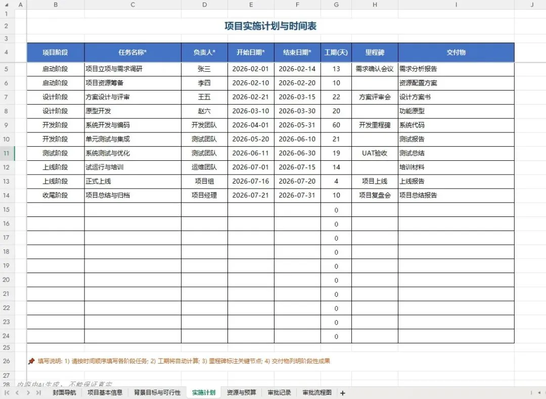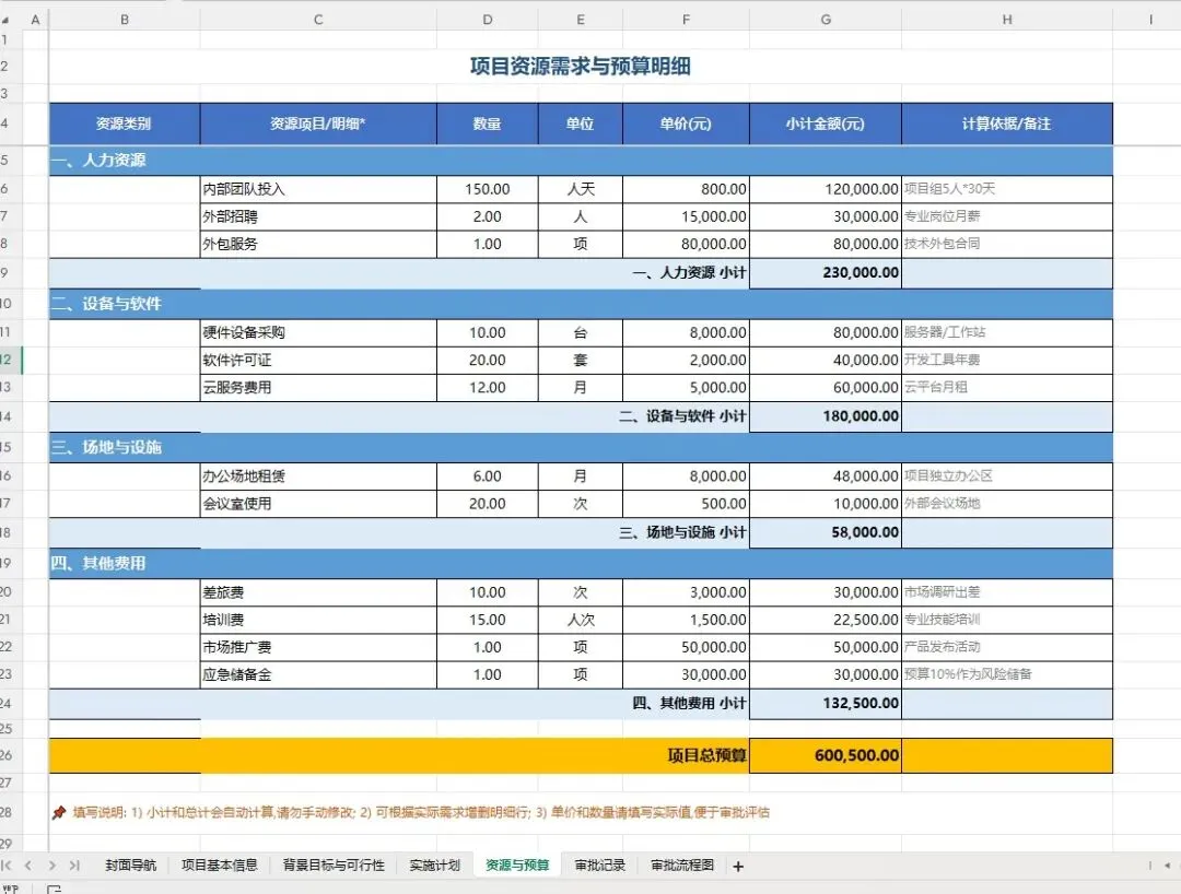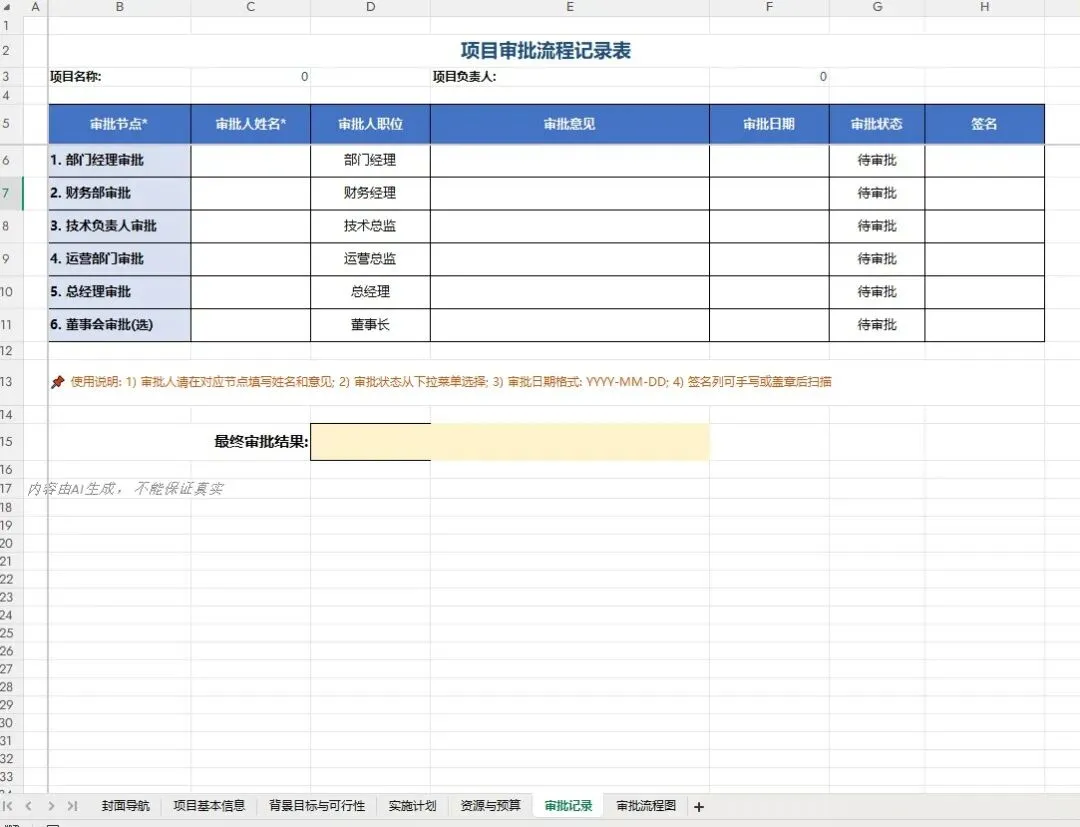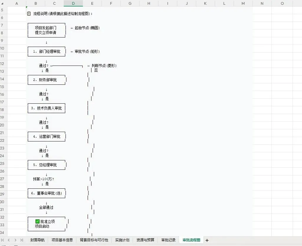 ✅ 项目立项审批表单模板已完成我已为您创建了一套专业、全面、智能化的项目立项审批Excel模板,完全满足您的需求: 📋 模板结构(7个工作表)1. 封面导航 - 提供模板版本信息、使用说明和快速导航超链接2. 项目基本信息 - 包含项目标识、时间规划、分类标签,支持下拉菜单选择和自动日期计算3. 背景目标与可行性 - 12个分析维度,覆盖项目背景、目标、市场/技术可行性、风险评估、预期效益4. 实施计划 - 甘特图式任务表,自动计算工期,里程碑高亮显示,包含10行示例+10行空白5. 资源与预算 - 四大类(人力/设备软件/场地/其他)共12项费用明细,三级自动汇总(明细→小计→总计)6. 审批记录 - 6个审批节点(部门经理→财务→技术→运营→总经理→董事会),状态下拉管理7. 审批流程图 - A4打印优化,提供文本流程描述供绘制专业流程图 🎯 智能化特性