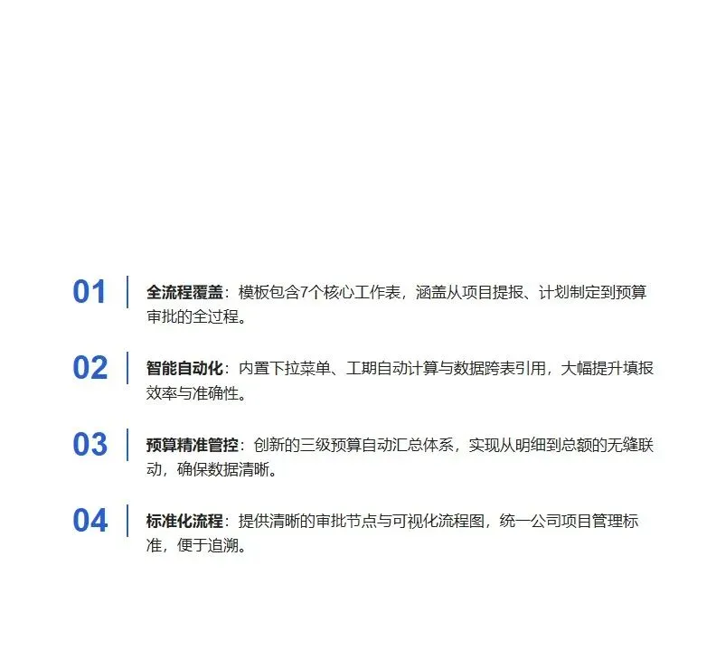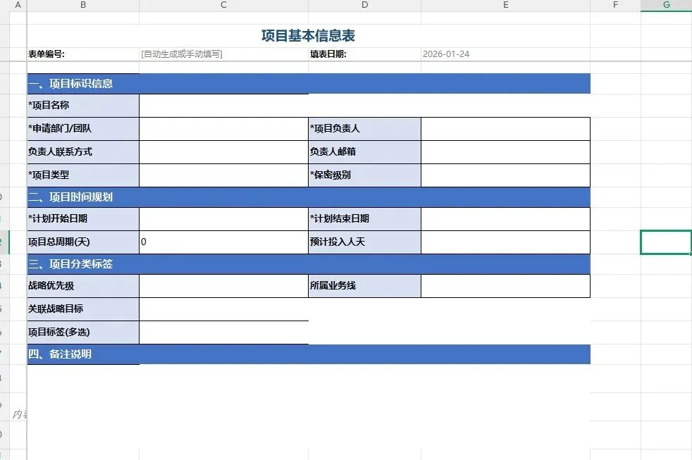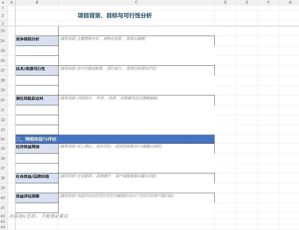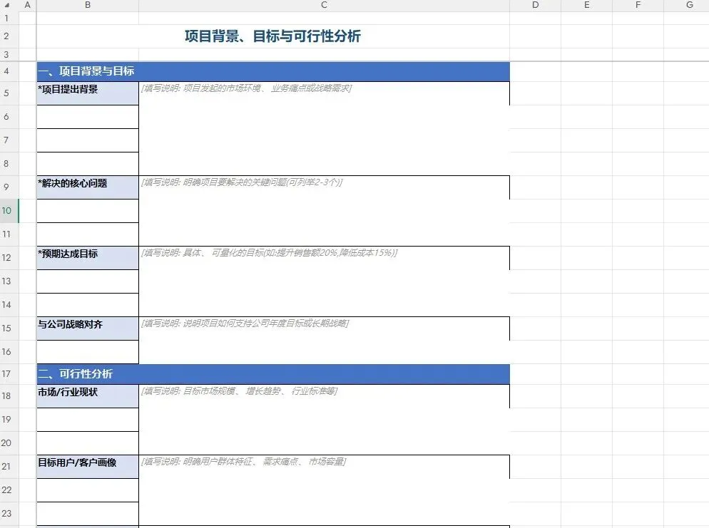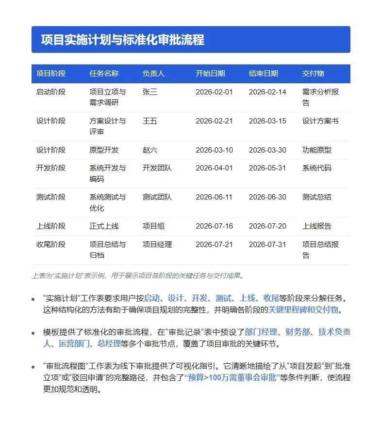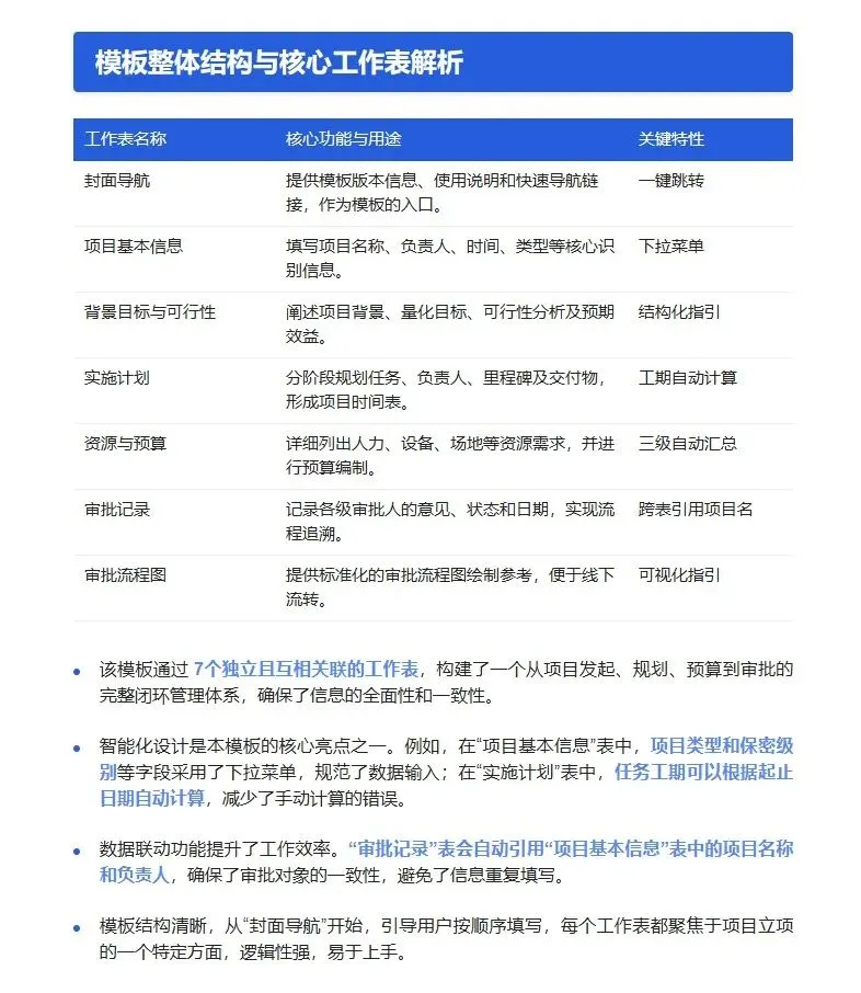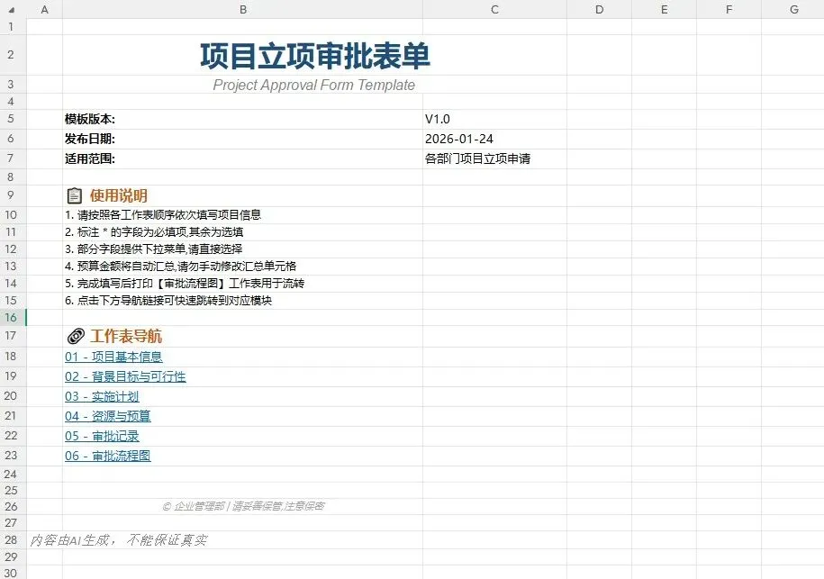 🧠 任务综合分析目标解读: 设计一套专业的项目立项审批Excel模板,需包含项目介绍(基本信息/背景目标/可行性/效益)、实施计划、资源预算、审批流程四大模块。隐式约束识别: