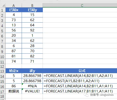 1)如果 x 为非数字,则 FORECAST 和 FORECAST.LINEAR 返回 #VALUE! 错误值。