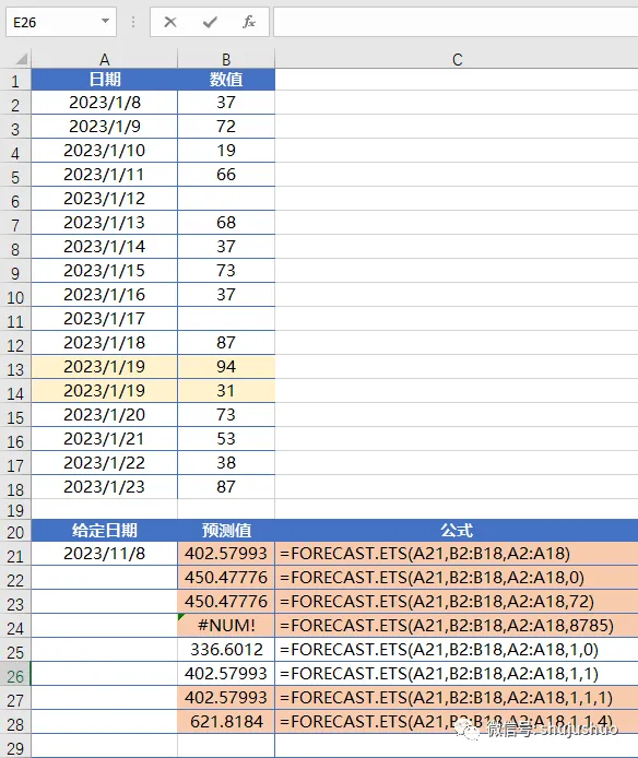 Target_date预测日期,需要进行值预测的数据点。目标日期可以是日期/时间或数字。如果目标日期在历史时间线结束之前按时间顺序排序,则 FORECAST。ETS 返回#NUM!错误。