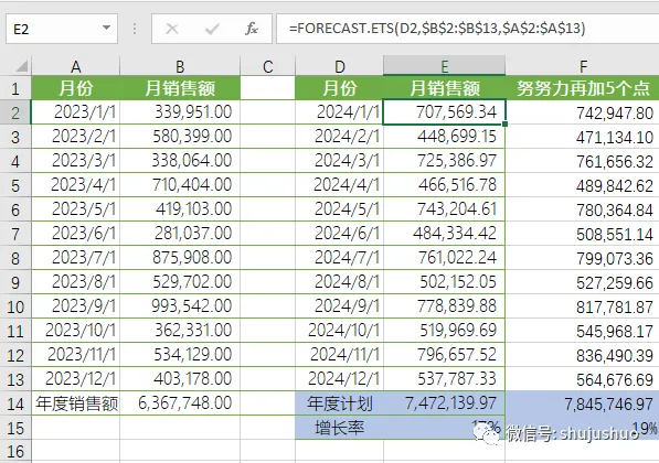当然,为了鼓舞士气,咱们可以再加5个点,F2单元格公式“=FORECAST.ETS(D2,$B$2:$B$13,$A$2:$A$13)*1.05”。