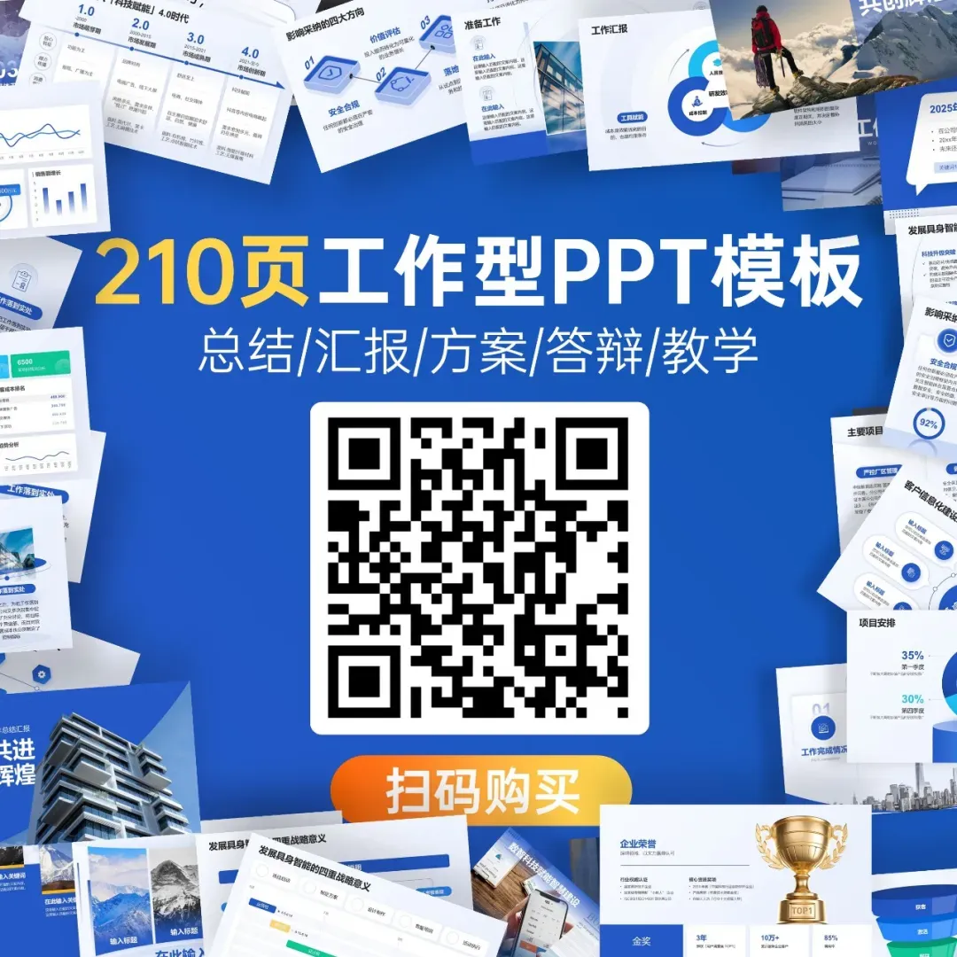 以上就是今天的主要内容,对了,我最近刚刚上线了210页工作型PPT模板,里面就有进度图的模板,大家可以看下。这套PPT模板,包含23种常见页面类型,非常适合日常工作。过后,立刻涨价恢复到99元,有需要,直接扫描二维码购买