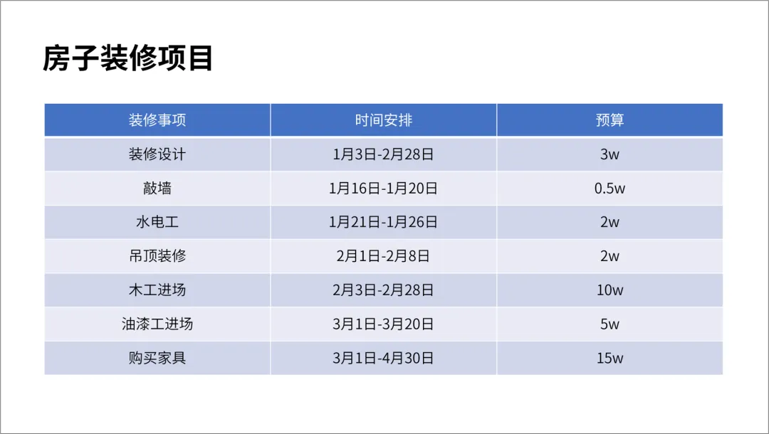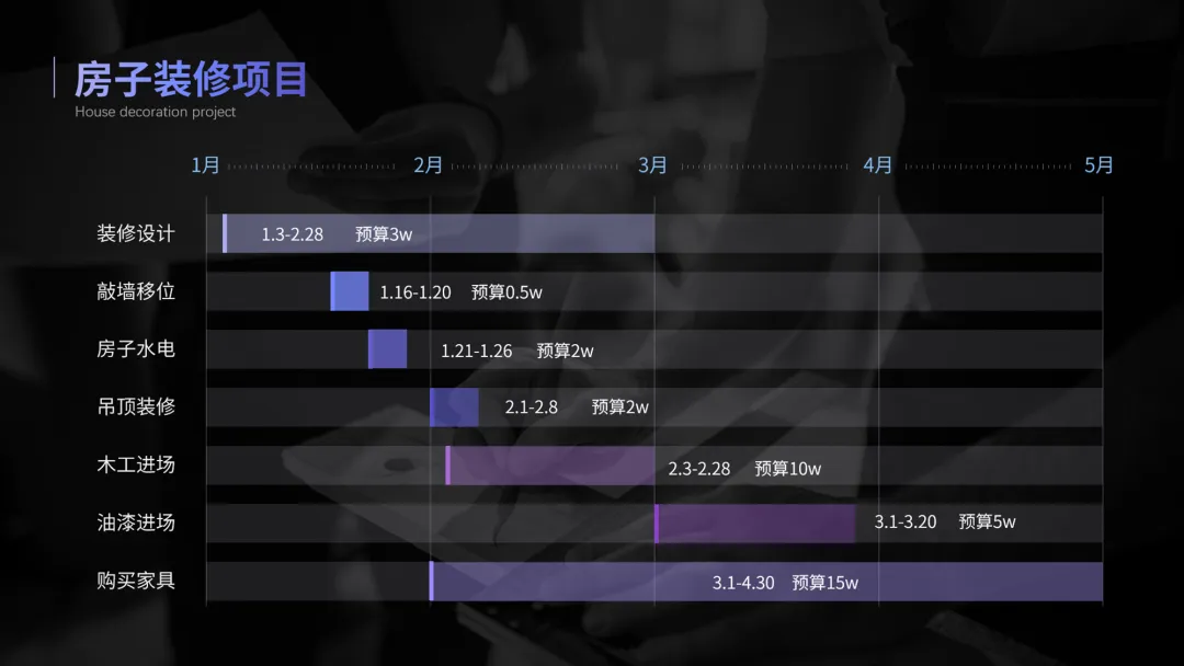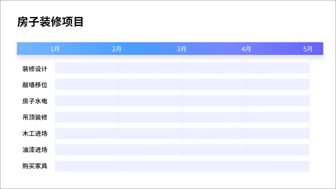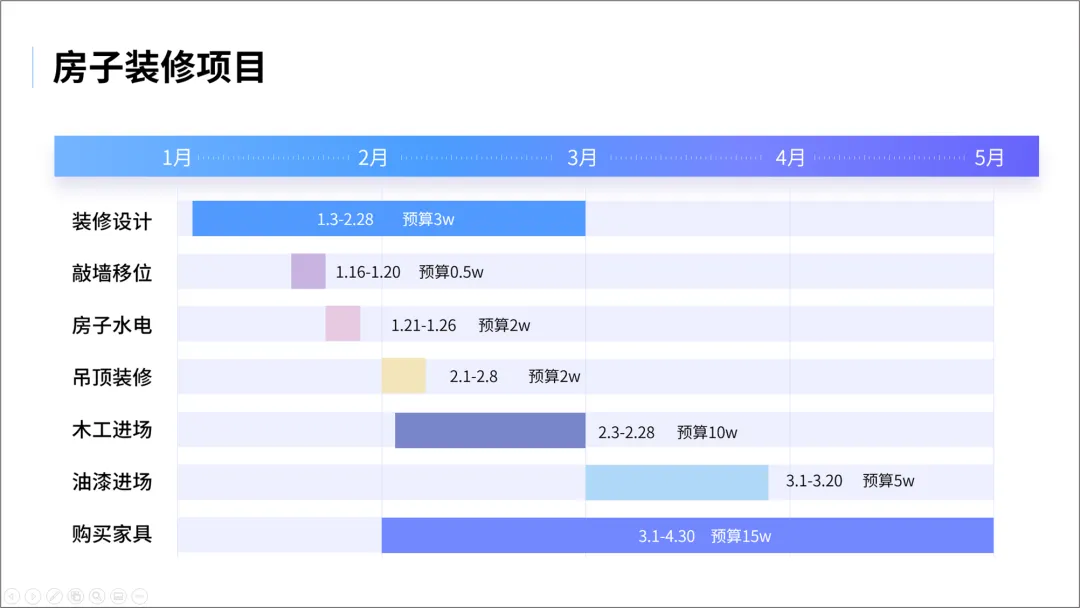 我们再来看第三种,甘特图,主要是通过色块来做项目进度表。这个表,我之前用过哈,因为我们家去年刚装修过。