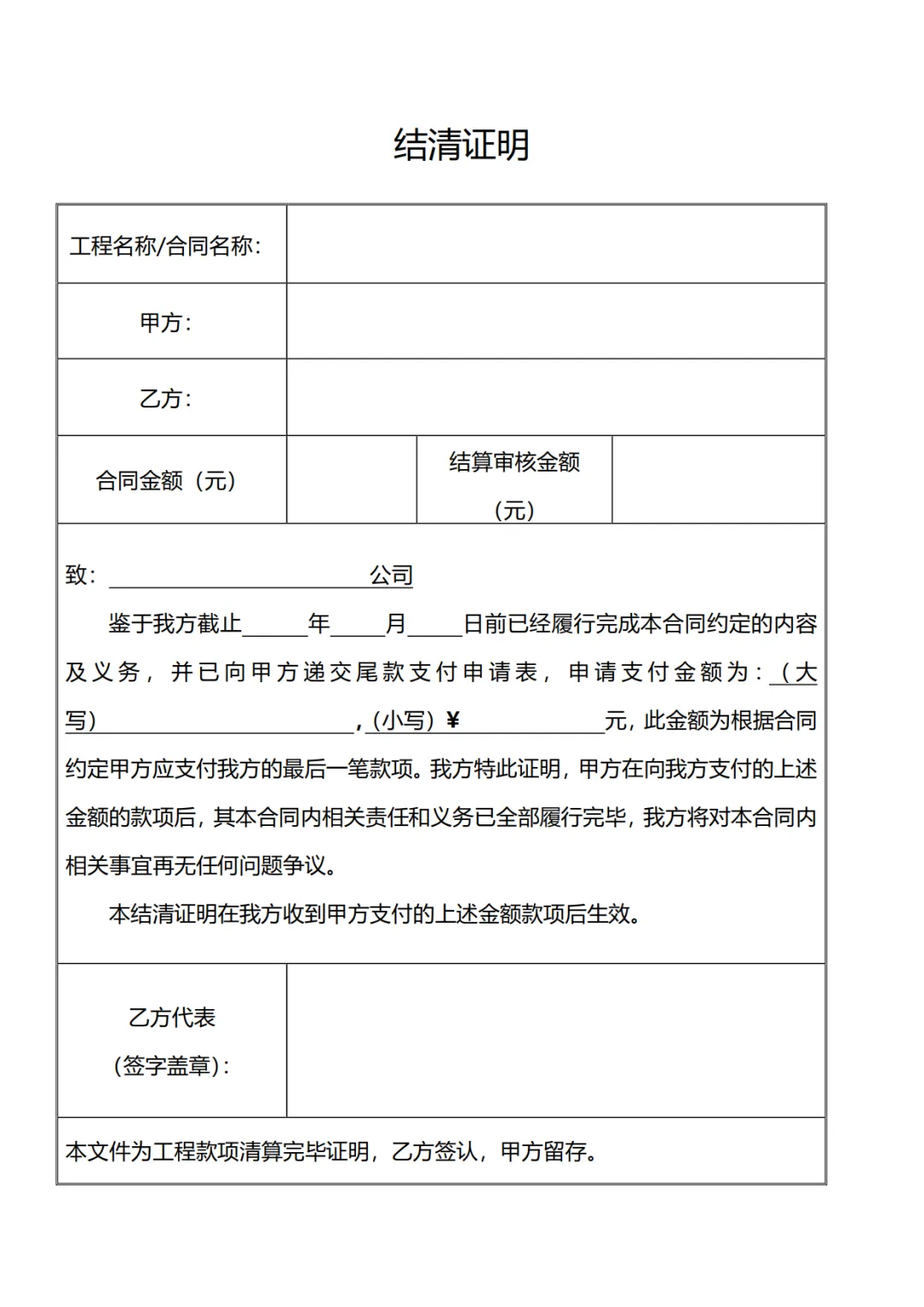 >工程付款结清证明模板,WORD文档电子版,可免费下载打印