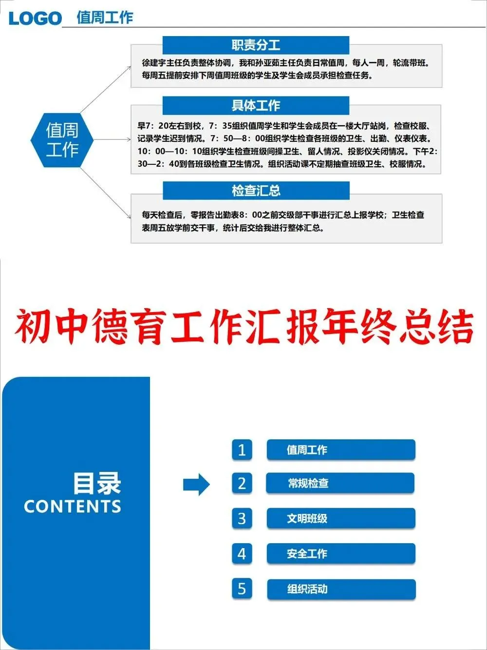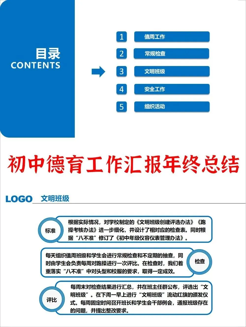 初中年级德育工作汇报述职报告ppt(电子版文档,无水印可编辑)文档简介 该文档为初中年级德育工作汇报述职报告,详细介绍了初中年级在值周工作、常规检查、文明班级评选、安全工作及组织活动等方面的职责分工、具体工作内容、检查汇总方式及实施成效,全面展示了年级德育工作的组织与实施情况。 文档大纲 值周工作 常规检查 文明班级 安全工作 组织活动