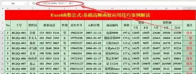 操作方法:在目标单元格中输入公式:=IF(N4>50000,"优秀","一般")。