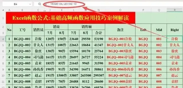 提取姓名时Right和Len函数嵌套使用,其实就是用Len提取字符串的长度,然后减去字母和数字的长度,剩下的就是姓名的长度。