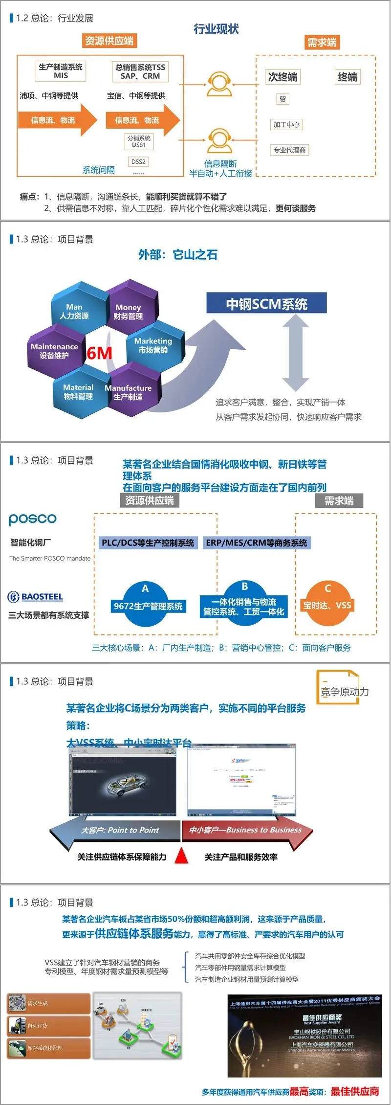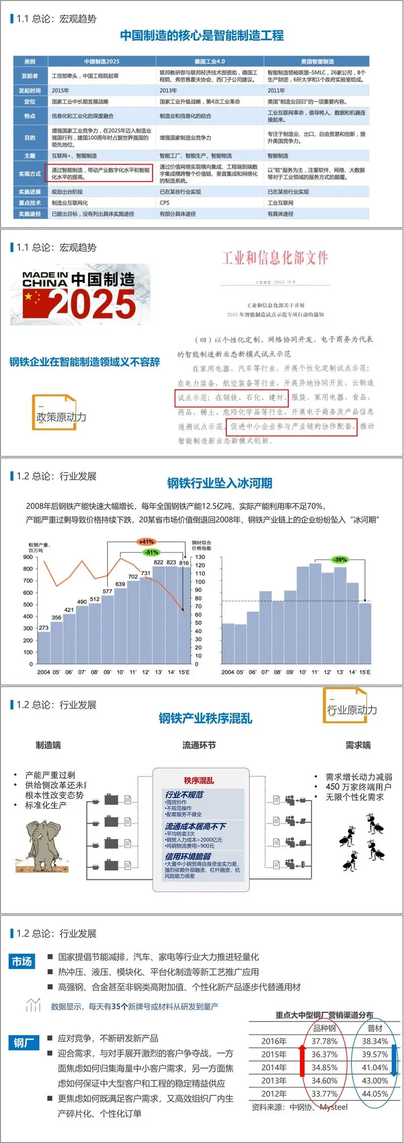 然而,钢铁行业自身正面临严峻挑战。自2008年后,产能严重过剩导致价格持续下跌,行业坠入“冰河期”。产业链秩序混乱,制造端产能过剩,流通环节冗长,需求端(高达450万家终端用户)需求日益个性化,而供给侧改革尚未根本扭转态势。市场竞争迫使钢厂不断研发高附加值新产品,但同时也焦虑于如何归集海量中小客户需求、保障大客户精益供应,并高效组织厂内生产应对碎片化订单。