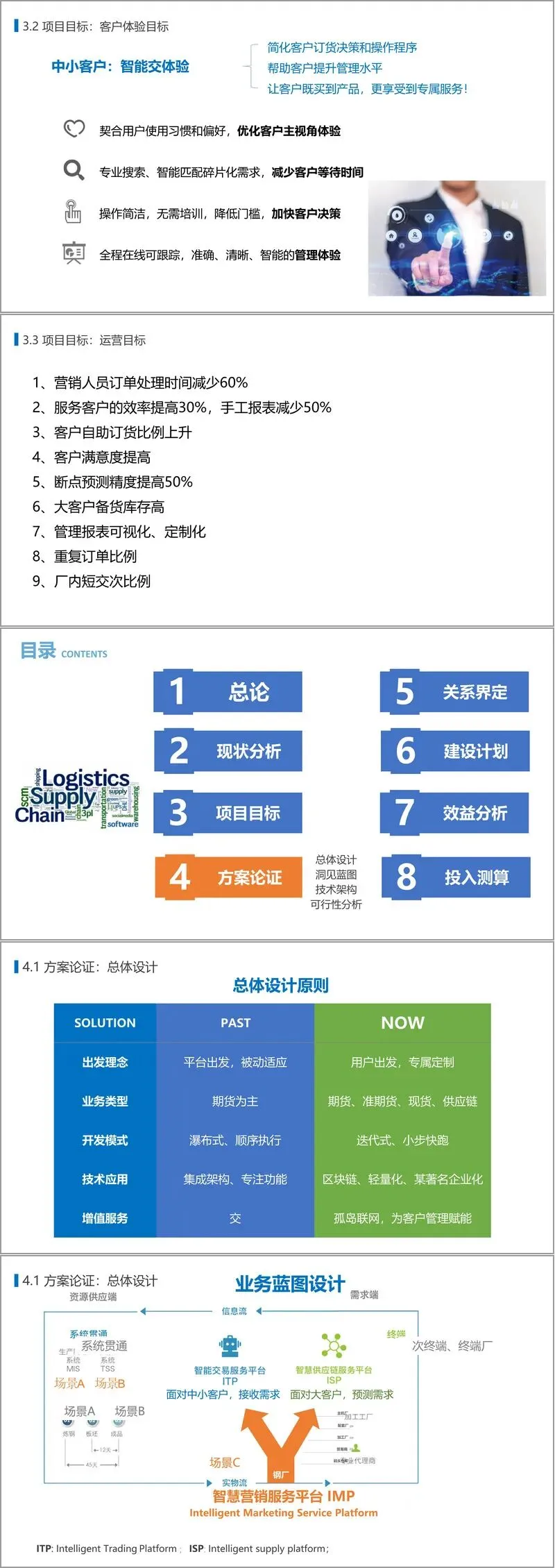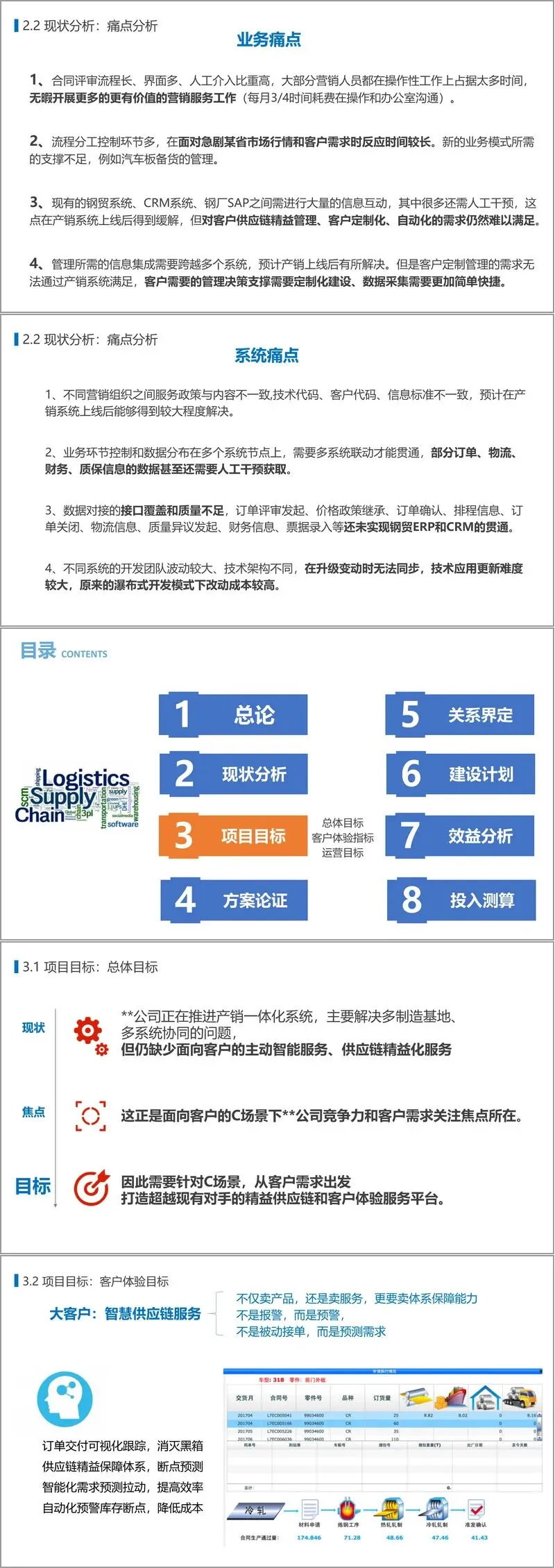 基于以上分析,方案明确了项目目标。总体目标是依托企业正在推进的产销一体化系统(主要解决内部协同),重点补强面向客户的“C场景”能力,打造超越竞争对手的精益供应链和客户体验服务平台。客户体验目标具体分为:面向大客户,提供智慧供应链服务,实现需求预测、断点预警、交付可视化管理;面向中小客户,提供智能交易体验,简化订货流程,实现专业搜索、智能匹配、全程在线跟踪。运营目标则包括订单处理时间减少60%、服务效率提高30%、客户满意度提升等一系列可量化指标。