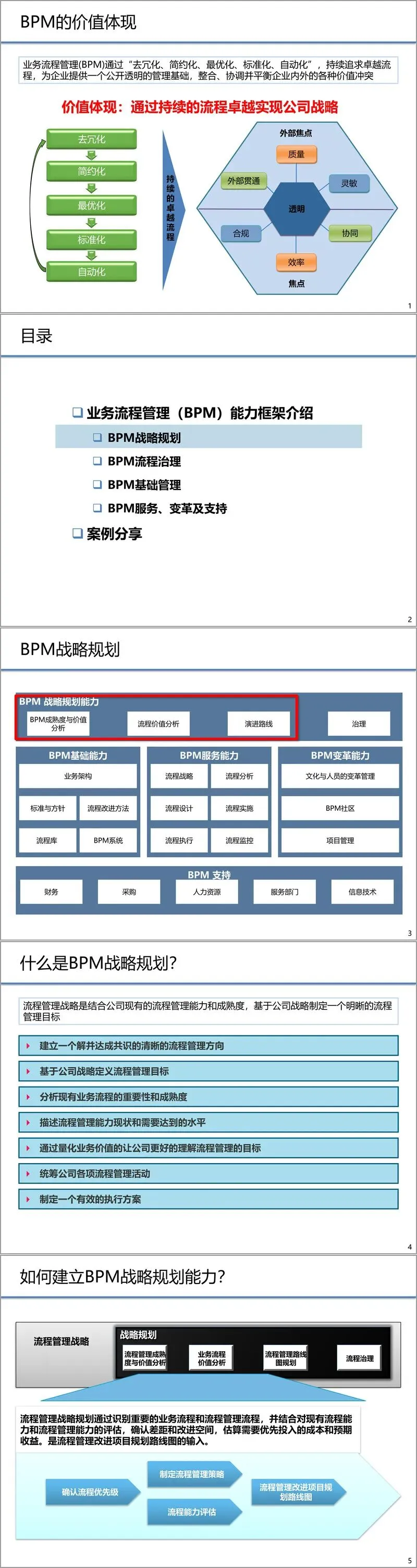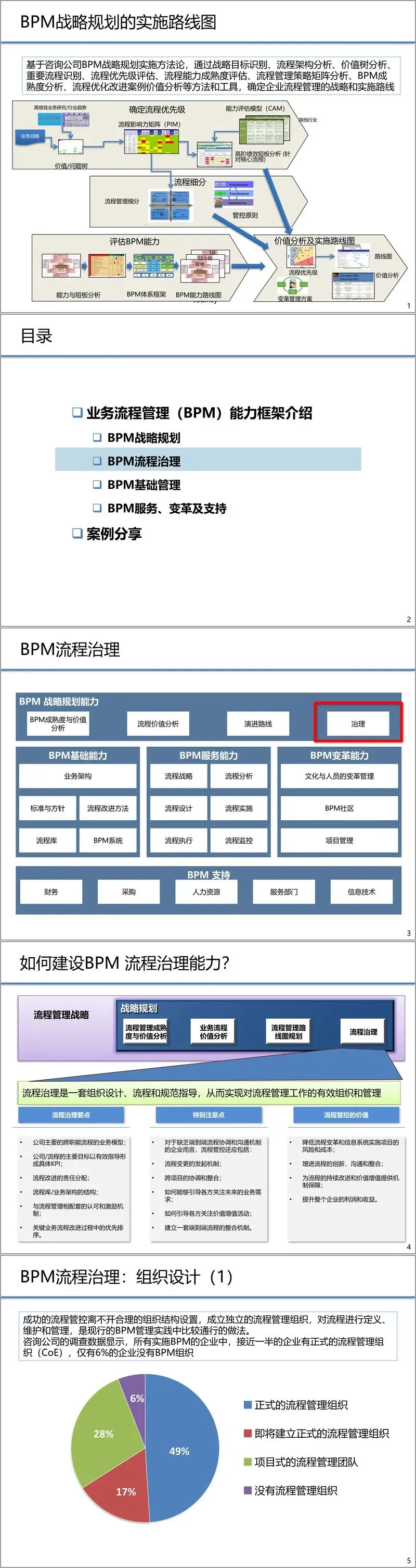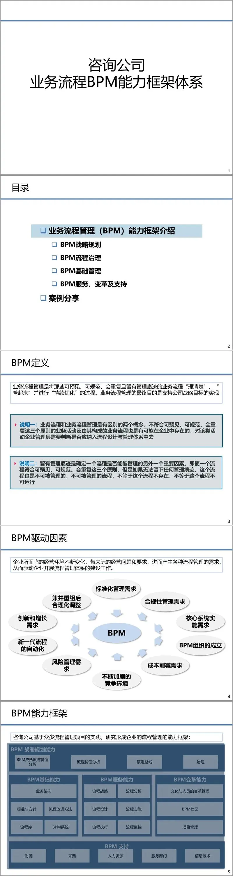 企业推动BPM建设,往往由内外部的多重因素驱动。文件列举了包括标准化管理、兼并重组后的整合、合规性要求、创新增长、核心系统实施、风险管理、成本削减以及日益激烈的竞争环境等关键驱动因素。这些因素共同促使企业必须构建起成熟的流程管理能力,以应对挑战,把握机遇。
