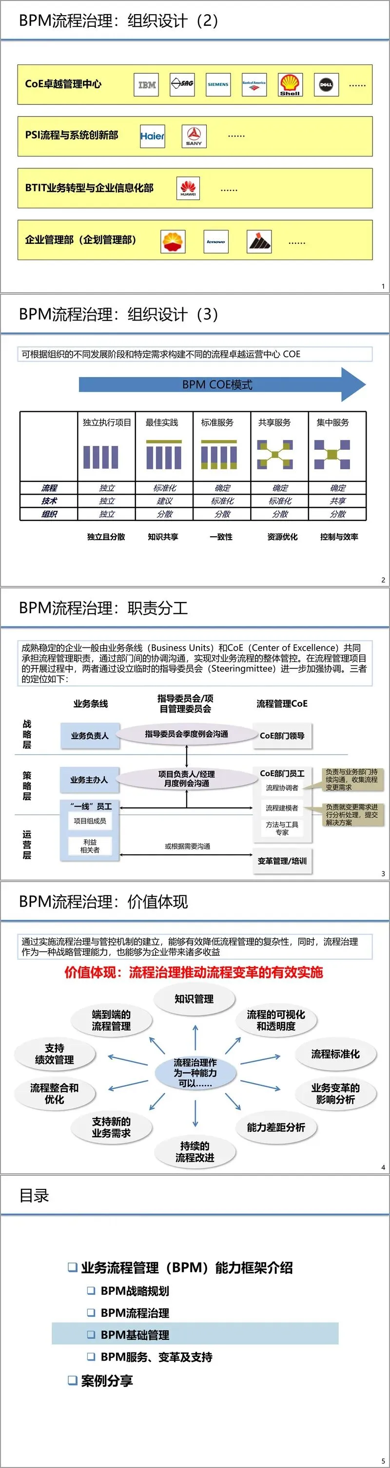 为了佐证理论框架,文件分享了华为、中兴、大唐国际、中国石油以及壳牌(Shell)等企业的实践经验。这些案例从不同侧面揭示了BPM实践的挑战与解决方案。例如,华为的经验展示了如何建立业务与IT整合的管理体系,通过BTIT部门统筹流程变革,并将战略、企业架构与变革项目进行建模联动。大唐国际的案例则重点解决了制度与流程“两张皮”的问题,通过“六位一体”(制度、流程、岗位、风险、绩效、表单)的建模方法实现了管理体系的整合。中国石油的案例强调了“五个统一”(统一架构、语言、平台、监控、优化)在大型集团企业流程管理中的重要性。而壳牌的案例则体现了利用外部专业服务构建BPM卓越中心(CoE),以灵活、经济的方式支持全球业务部门的具体实践。