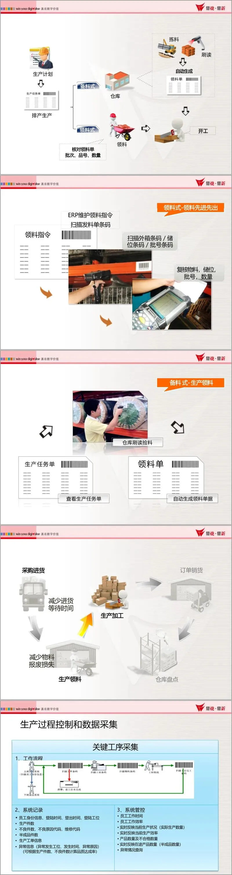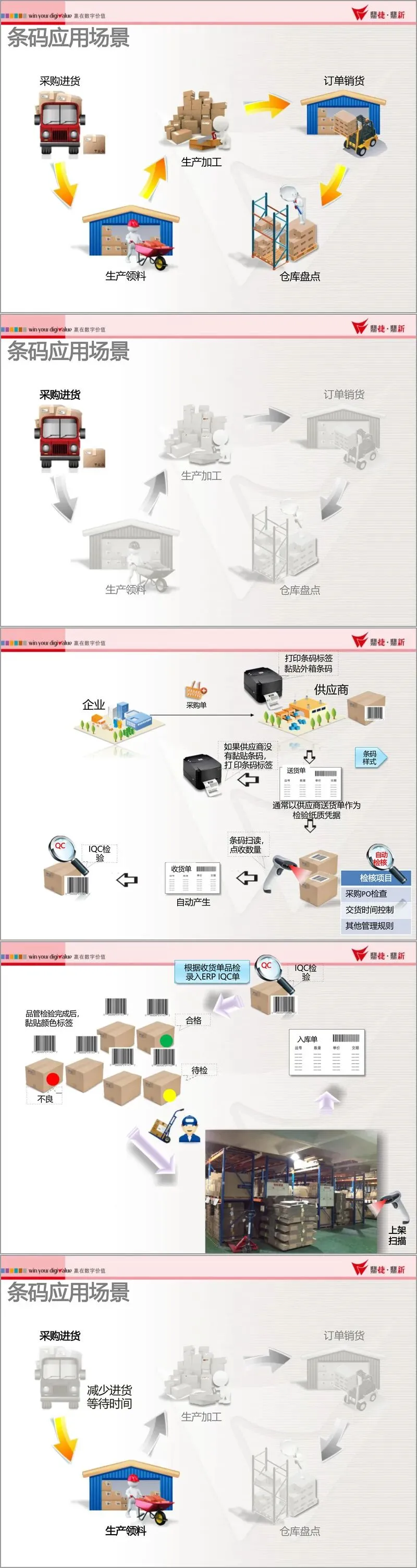 文档详细列举了条码系统在采购进货、生产领料、工单管理、产品质量追溯、销售出货及库存盘点等核心场景的应用流程。例如,在采购环节,通过条码自动检核送货单,快速生成收货单,显著减少了进货等待时间;在生产环节,通过工单条码管理,实现了对生产进度、班组绩效的实时监控与数据采集;在出货环节,通过扫描装箱条码进行销货检核,有效规避了发货错误;在盘点环节,利用手持设备可随时随地进行盘点,大幅提升了效率并降低了错误率。