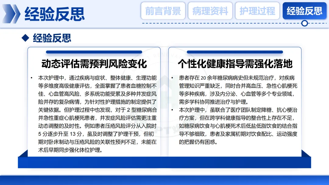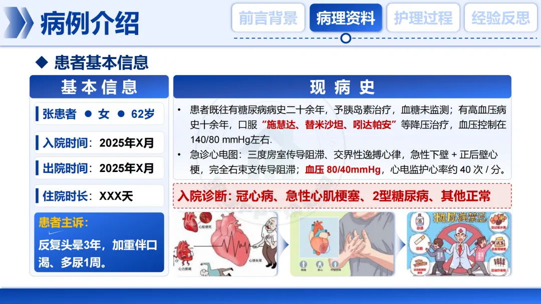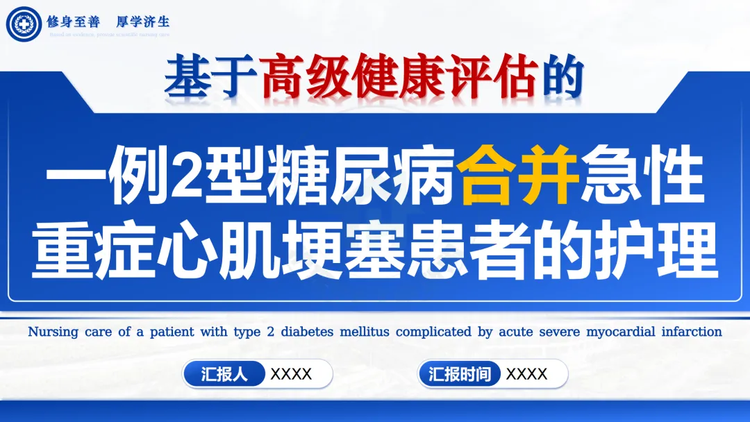 各位老师好,今天我分享一例“2型糖尿病合并急性重症心肌梗塞”患者的护理个案,展示我们如何运用高级健康评估进行系统化管理。