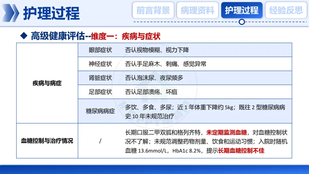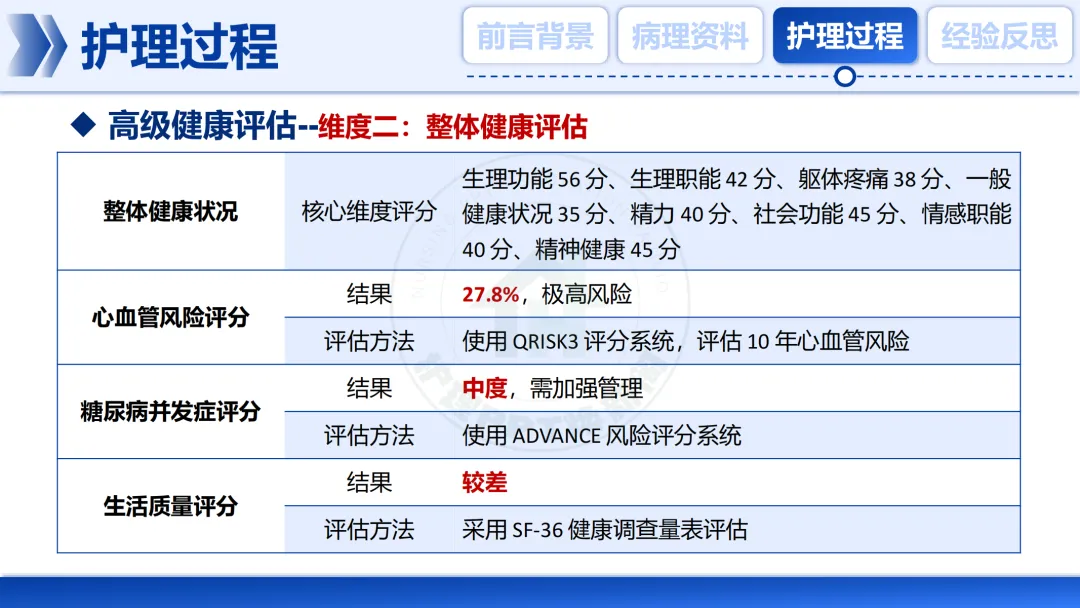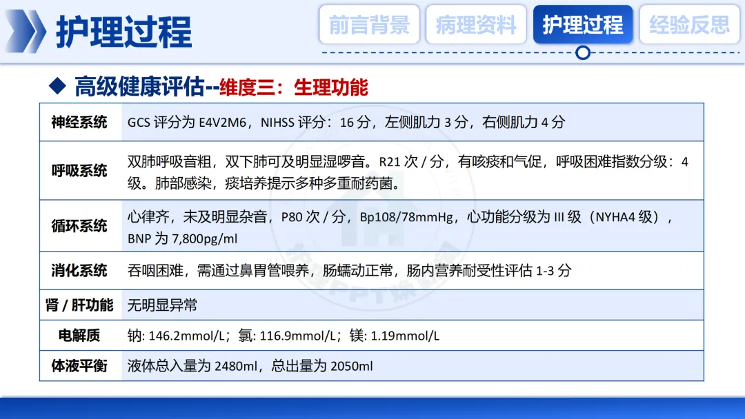 面对如此复杂的病情,我们启动了系统性的高级健康评估,这是制定📑护理计划的核心依据。