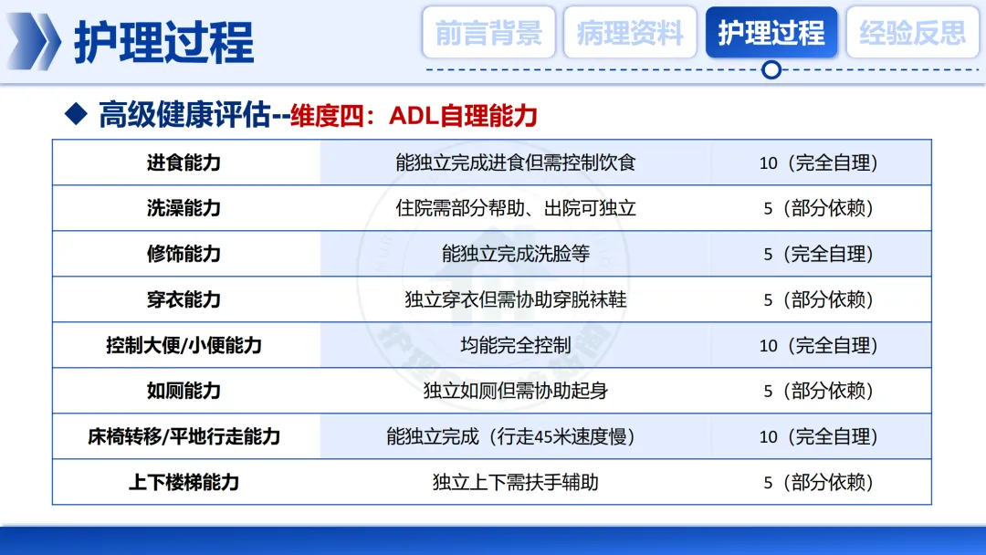 日常生活能力评估显示,患者在洗澡🛀、穿衣👔等方面存在部分依赖,需要针对性的协助与指导。