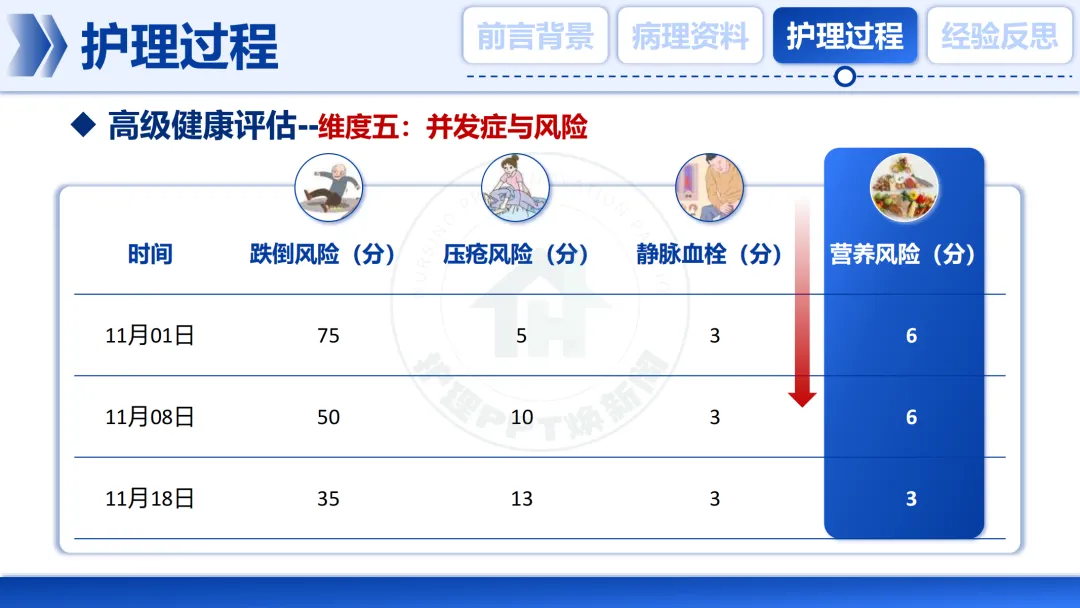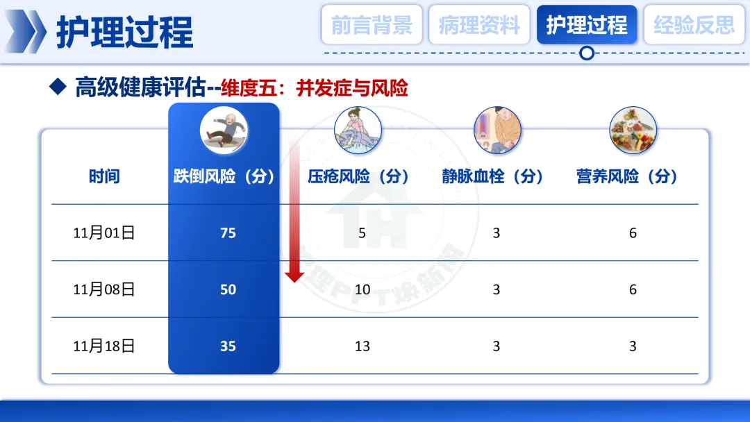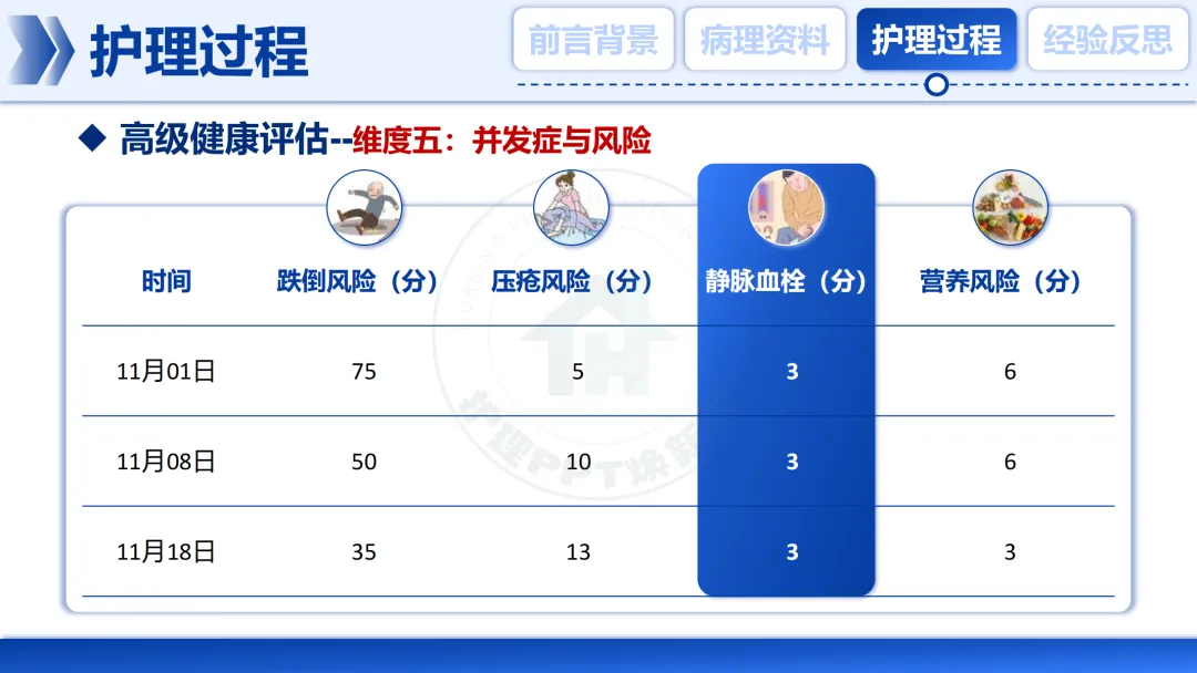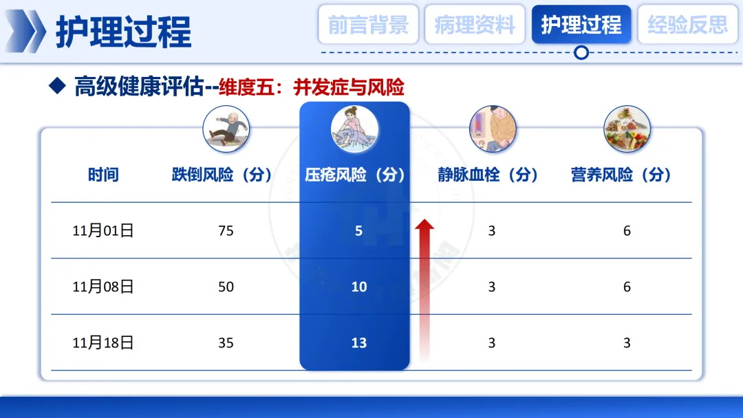 我们持续监测👀其跌倒、压疮、血栓等风险,评分随着卧床时间而变化,这要求我们的护理措施必须动态调整。
