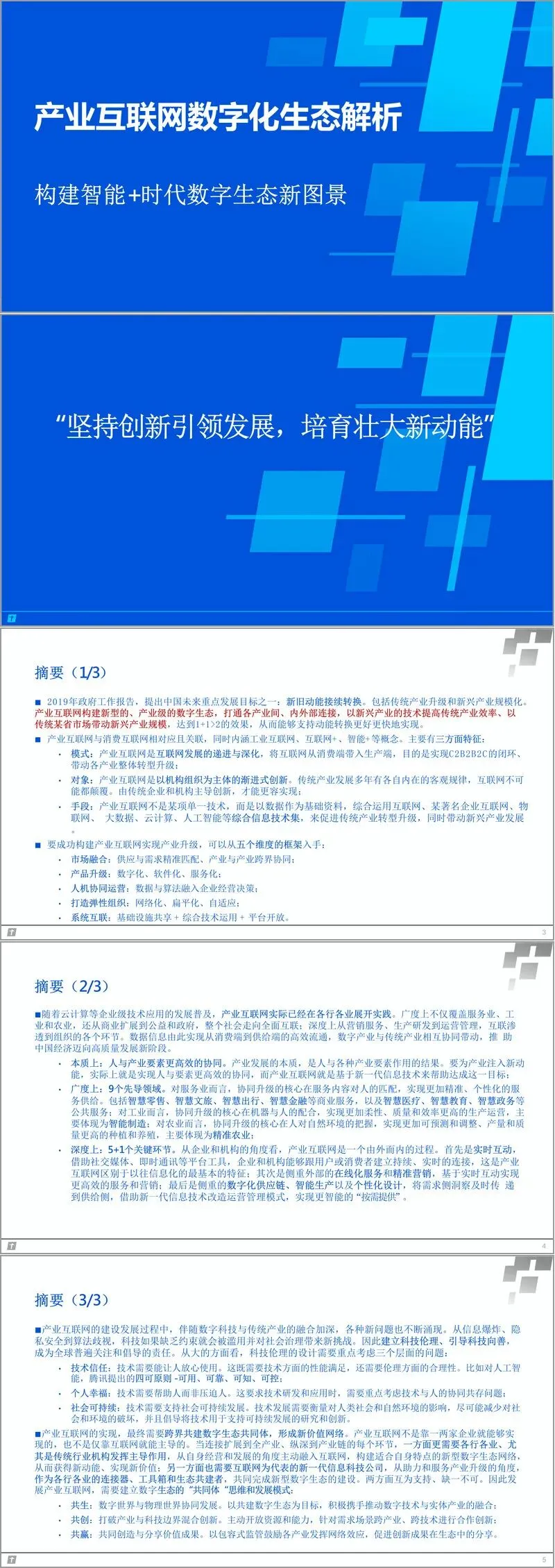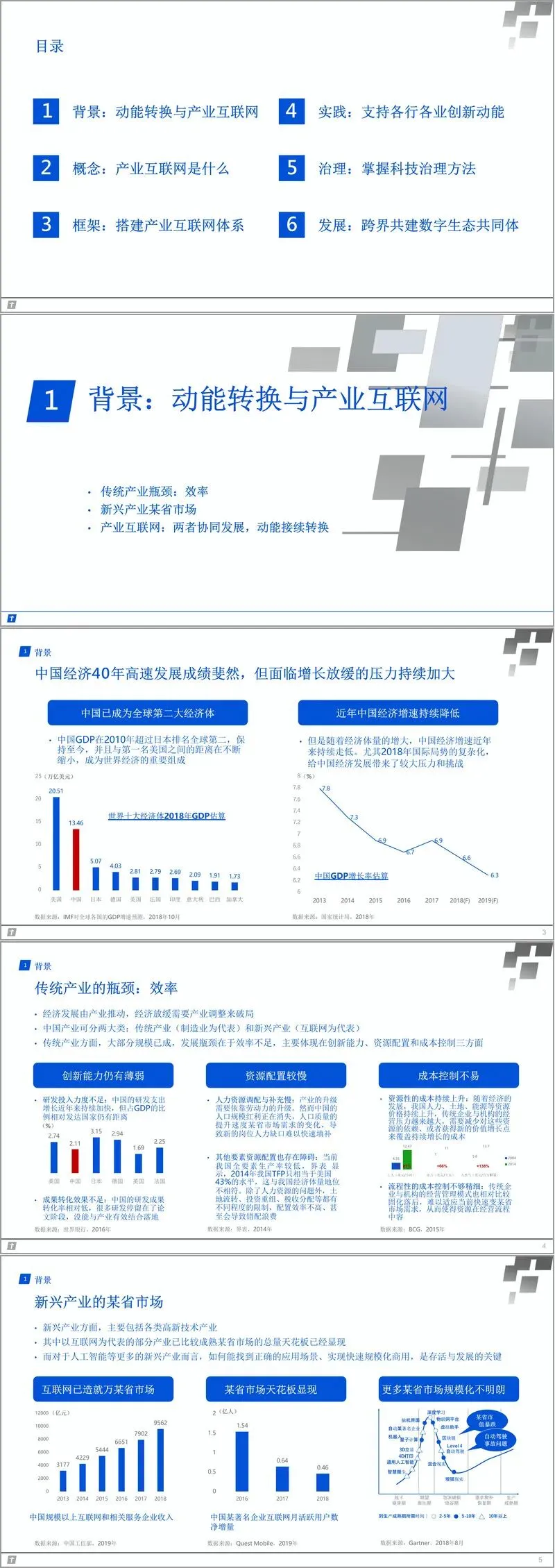 这份文件深入剖析了在“智能+”时代背景下,产业互联网作为驱动中国经济新旧动能转换的核心引擎,如何构建一个全新的数字生态图景。报告开宗明义,援引2019年政府工作报告,指出中国经济发展的重点在于“新旧动能接续转换”,即通过传统产业升级与新兴产业规模化,实现经济的高质量发展。产业互联网正是实现这一目标的关键路径,它通过打通各产业内外部连接,促进新兴技术与传统产业深度融合,达到提升效率、扩大规模的协同效应,实现“1+1>2”的增值效果。