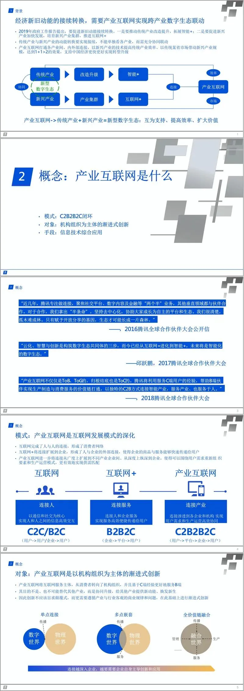 报告对产业互联网的概念进行了清晰界定。它并非孤立存在,而是与消费互联网相对应且关联,并内涵了工业互联网、“互联网+”、“智能+”等概念。其核心特征可归纳为三点:在模式上,它是互联网发展的深化,旨在构建从消费者到企业再回到消费者的C2B2B2C闭环,推动整体产业转型升级;在对象上,它强调以机构组织为主体进行渐进式创新,尊重行业客观规律,由传统企业主导;在手段上,它并非单一技术,而是以数据为基础,综合运用互联网、移动互联网、物联网、大数据、云计算、人工智能等新一代信息技术的集合。