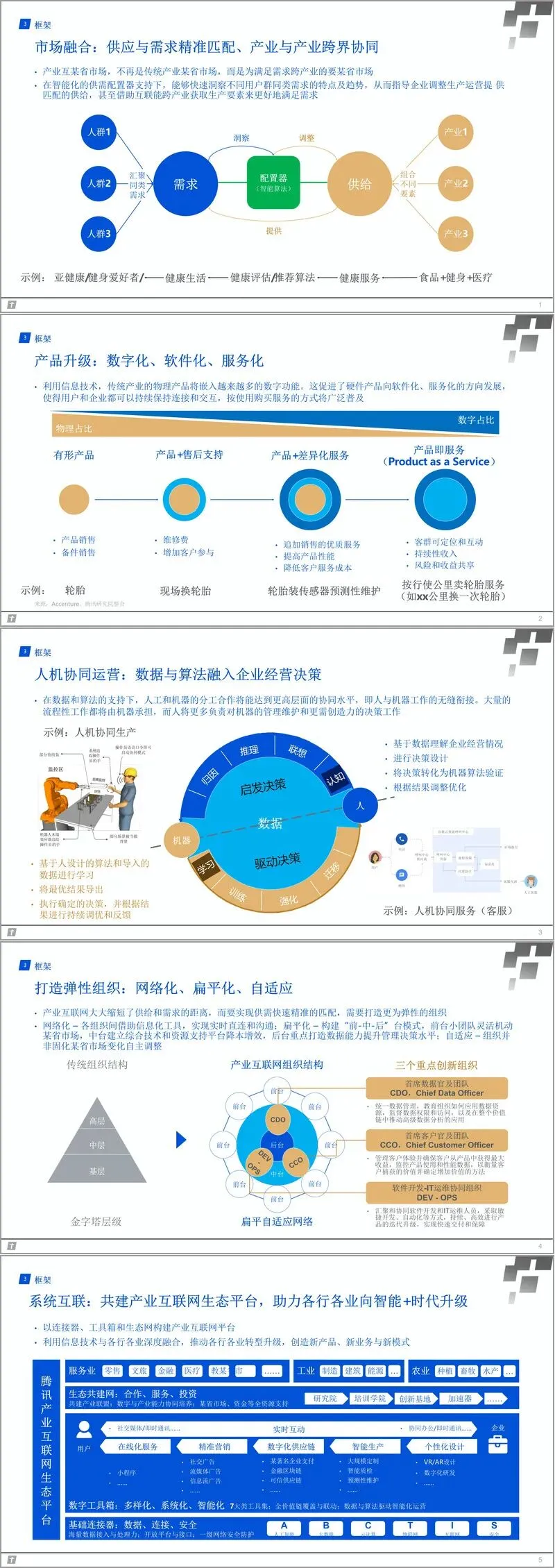 为了成功构建产业互联网,报告提出了一个五维度的框架体系。这五个维度包括:市场融合,实现供需精准匹配与产业跨界协同;产品升级,推动产品数字化、软件化和服务化;人机协同运营,将数据与算法深度融入企业经营决策;打造弹性组织,形成网络化、扁平化、自适应的组织结构;系统互联,实现基础设施共享、综合技术运用和平台开放。