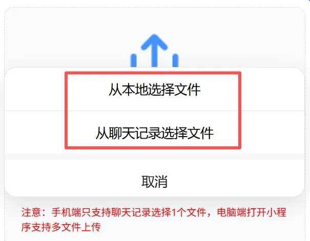 点击选择本地文件或者直接从聊天记录里面选择文件,就可以上传了。