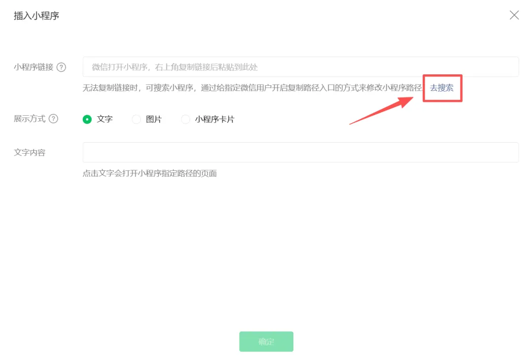 第二种是手动插入,直接复制小程序ID,需要在公众号编辑器里插入小程序,先选择去搜索。